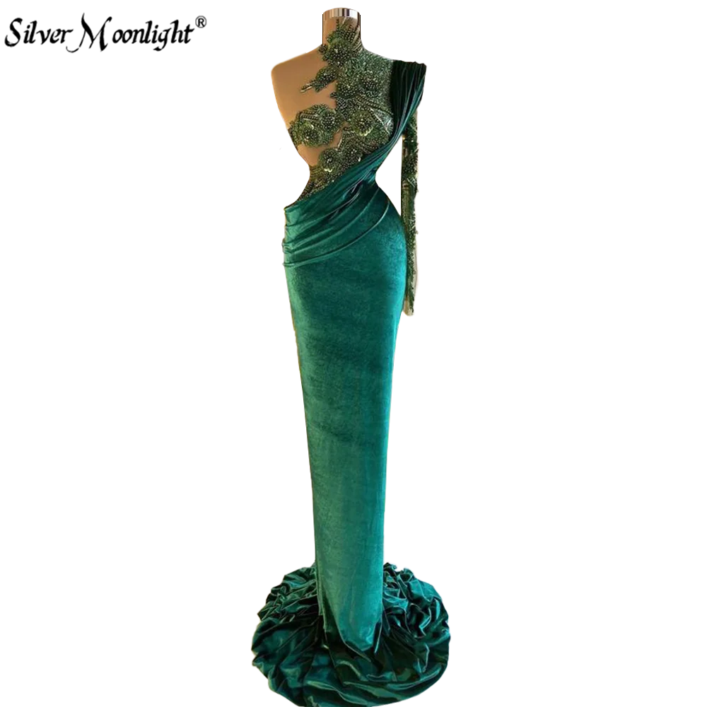 Темно-зеленые длинные вечерние платья с аппликацией из бисера на одно плечо, платья для выпускного вечера русалки для женщин, халаты, арабский Vestido De Fiesta