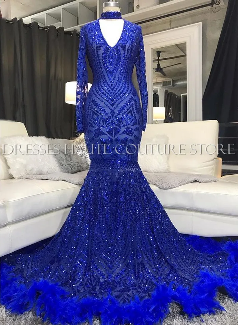 Женское длинное платье с V-образным вырезом, синее платье в африканском стиле, с блестками и перьями, для выпускного вечера, 2021