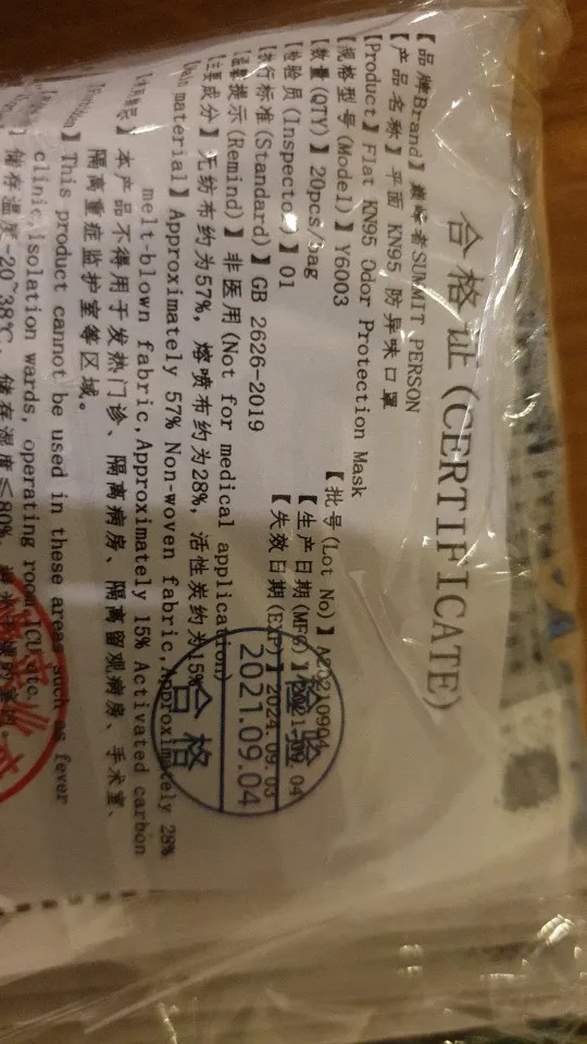 Для certificatu pishe, Da is NISO kirurshke MASKE. Ustrezajo PA standard KN95 в tudi oznaka them natisnjena для маски vsaki posebej. Стандарт: GB 2626-2019 Фильтр Vmesna Plast их и materiala, Da vsebuje и aktivnega oglja (активированный уголь).