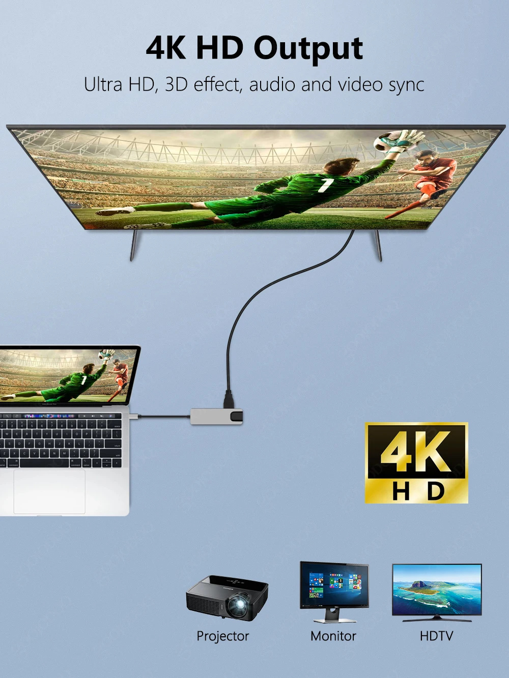 Увеличьте экран вашего ноутбука до телевизора, монитора или проектора с разрешением до 4K UHD (3840x2160 @ 30 Гц) через выходной порт HD. Обратная поддержка разрешений 2K / 1080p / 720p / 480p / 360p.