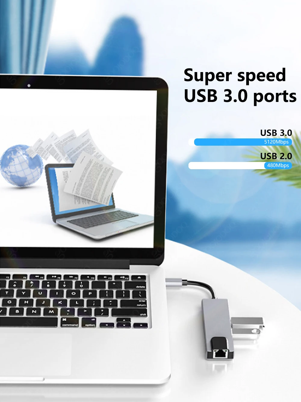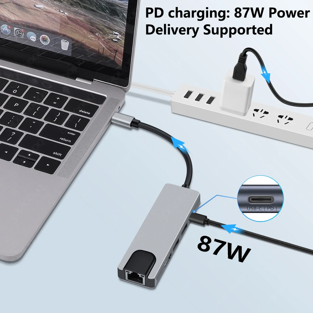 Зарядный порт USB-C Power Delivery, выход USB C на HDMI, 2 порта USB 3,0 s, порт Gigabit Ethernet (порт RJ45) функциональный и универсальный.