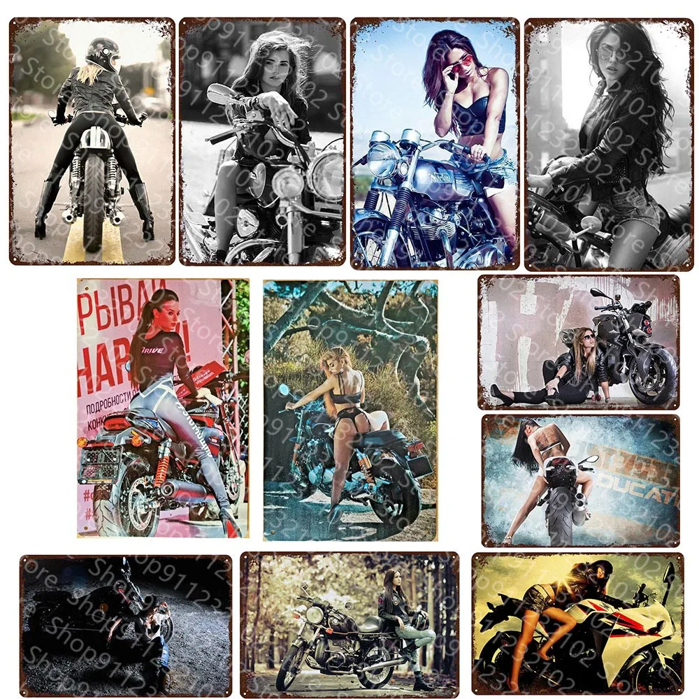 Эротичная девушка на мотоцикле, рустикальный металлический жестяной знак, украшение для паба, бара, жестяной знак, потертый шик, домашний декор, табличка, настенное искусство, мужская пещера