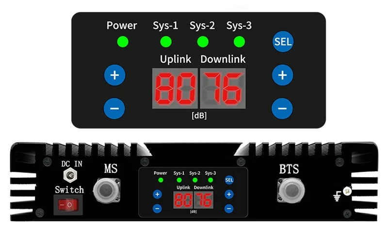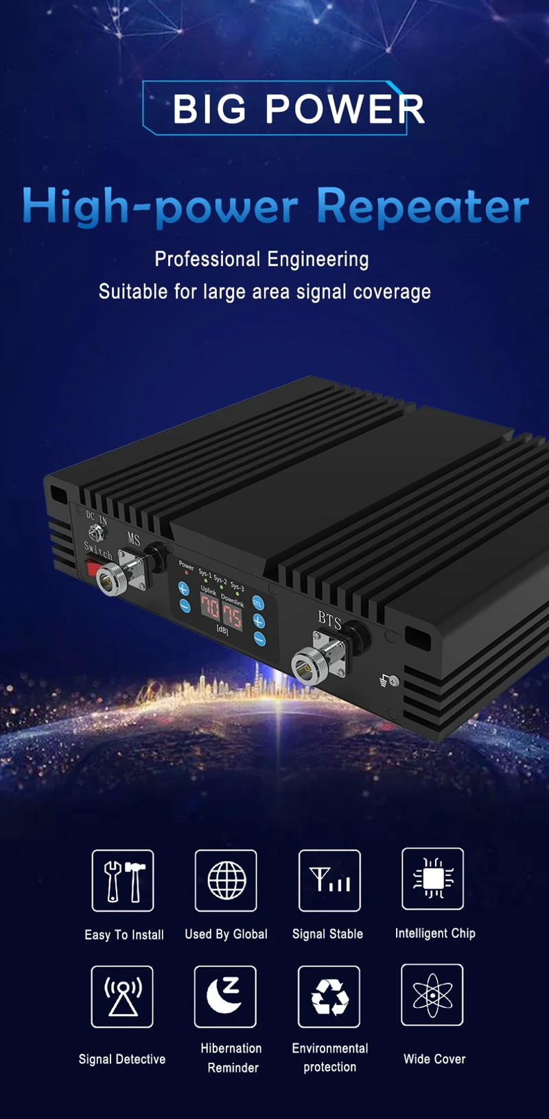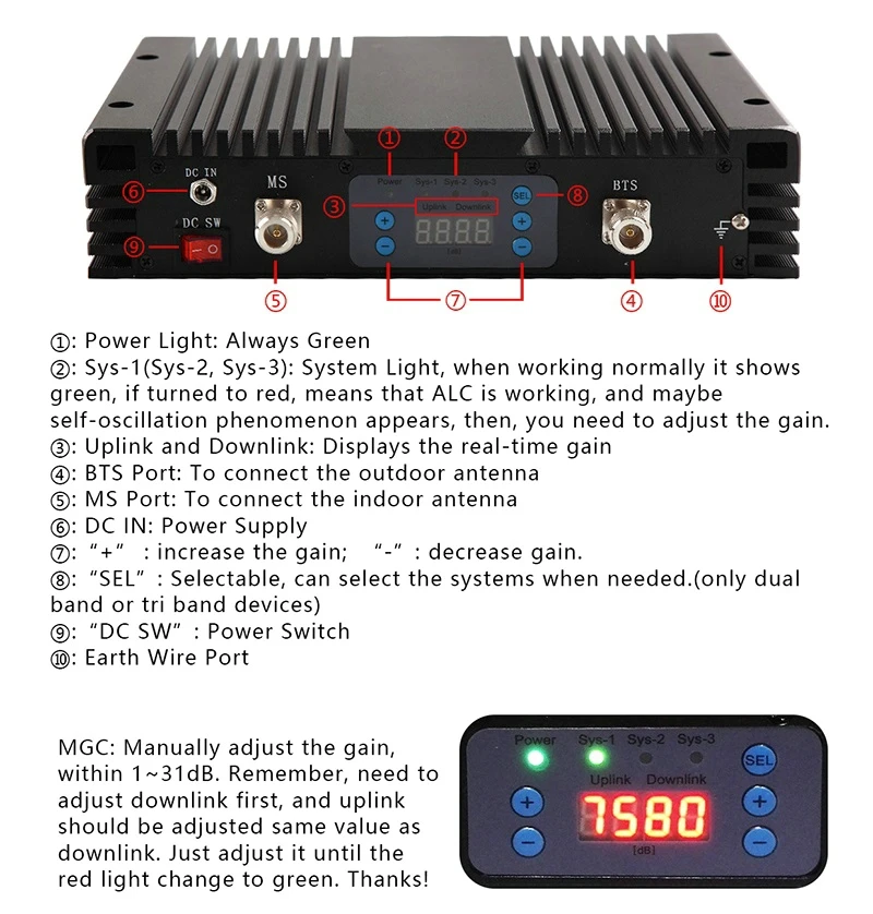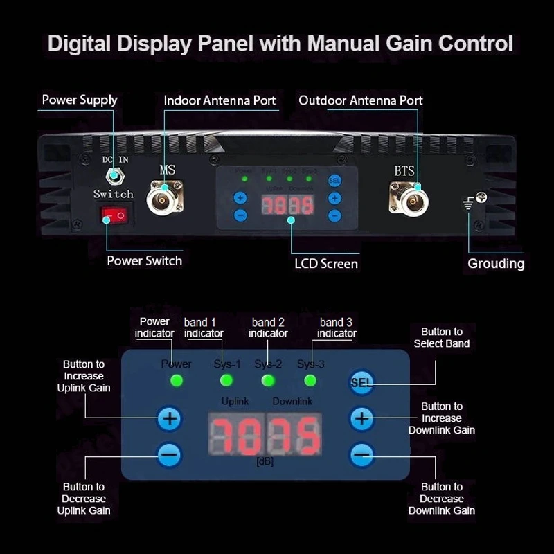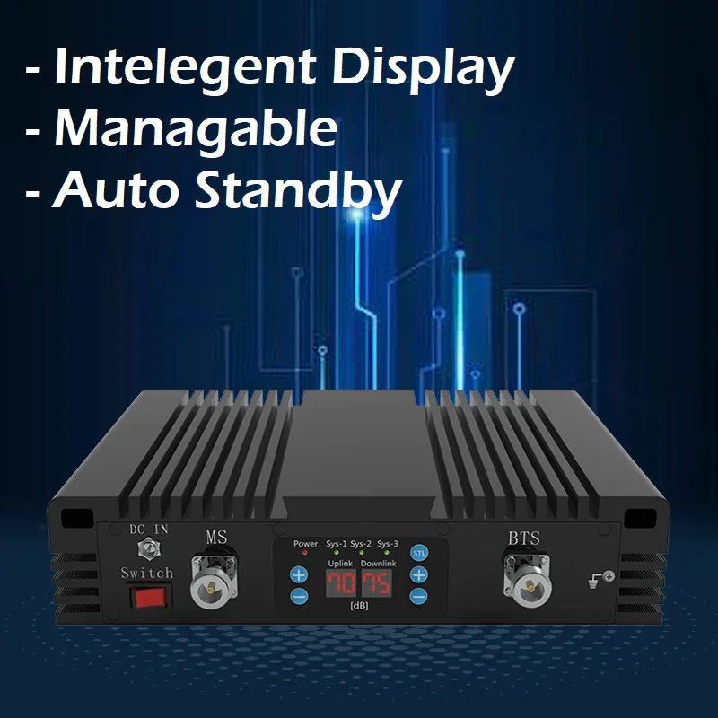 -Высокая мощность 33dBm + высокий коэффициент усиления 85 дБ-Покрытие 25000 квадратных футов-Поддержка 20 внутренних антенн-MGC/AGC предотвращает помехи-Управление ЖК-дисплеем + клавиатурой