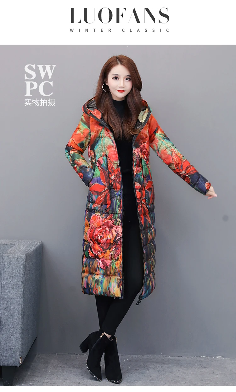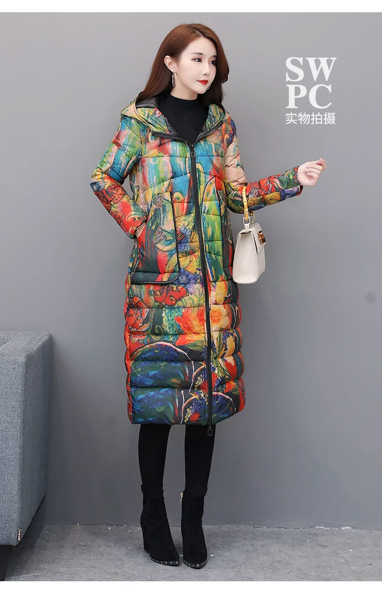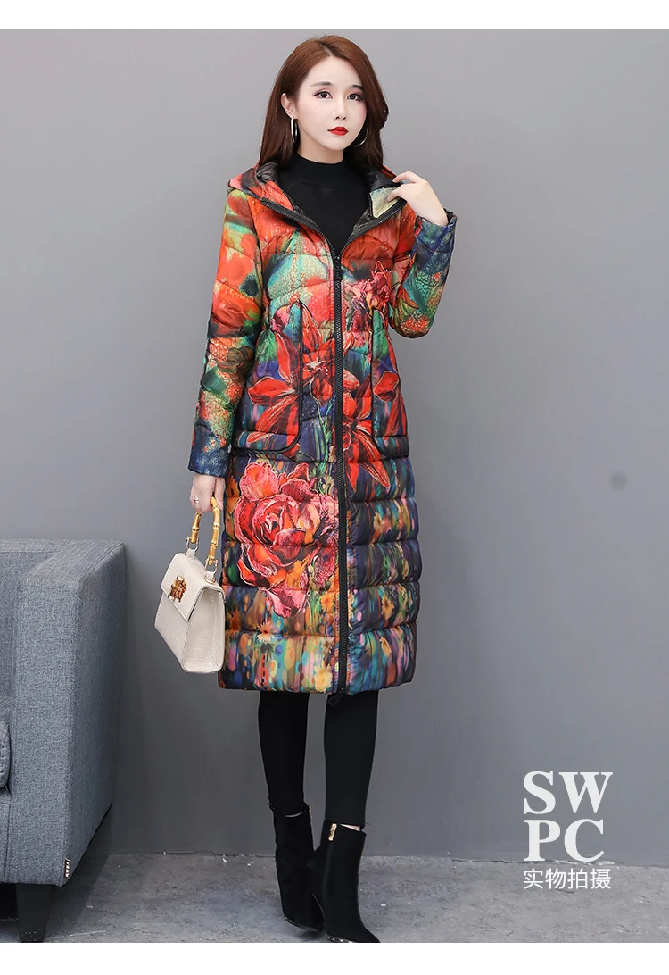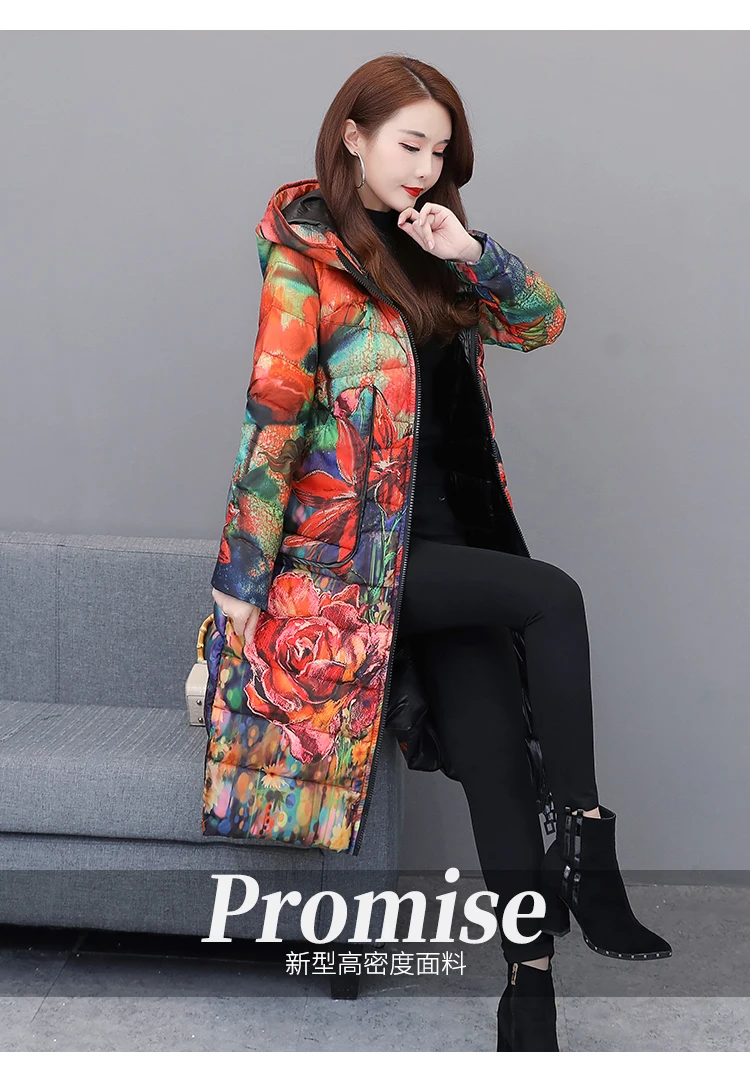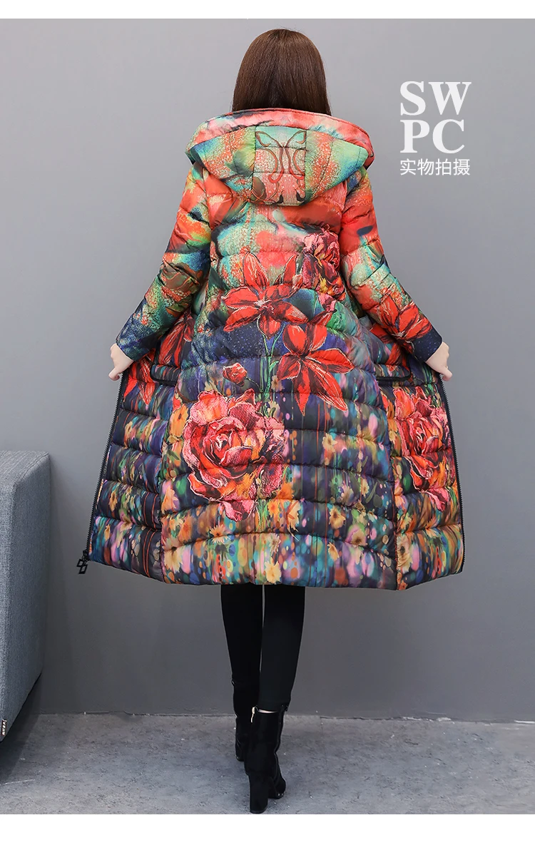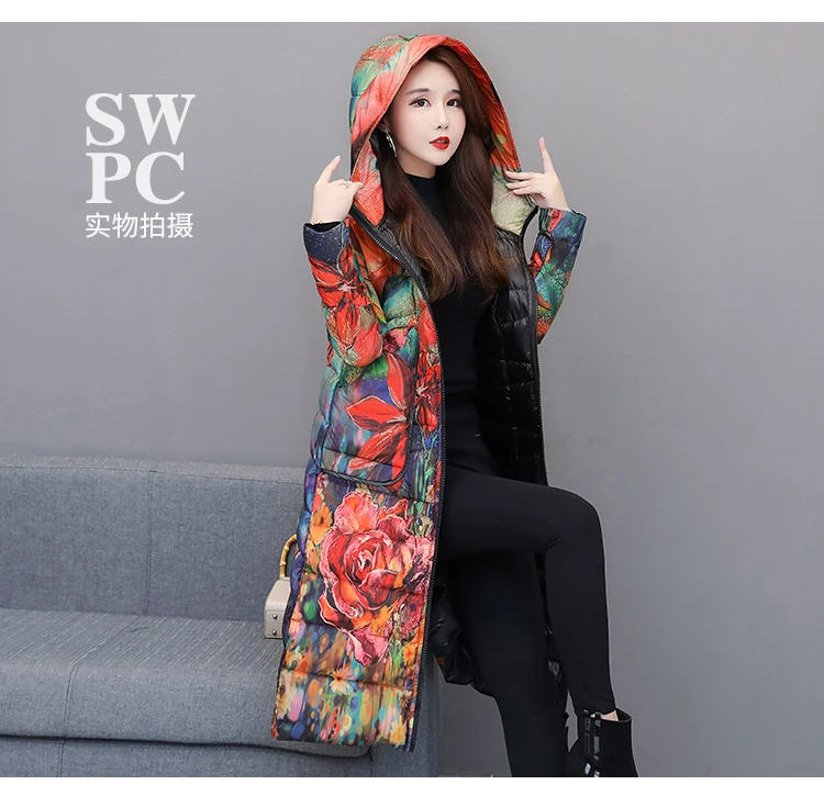 Женский пуховик, зимнее пальто с цветочным рисунком, длинная парка с капюшоном, 2021, 6XL, 1858