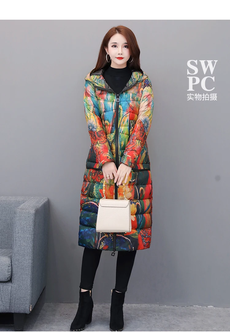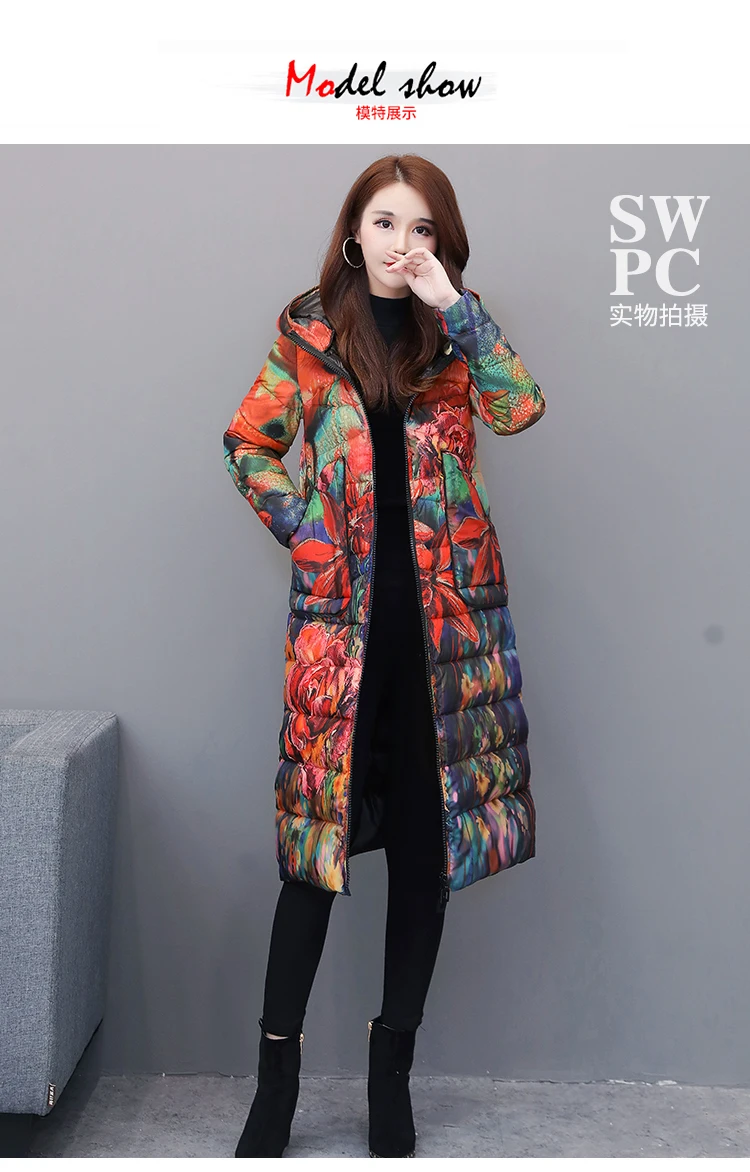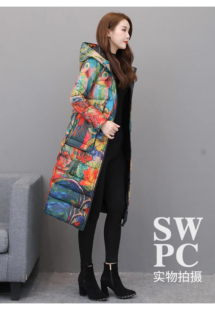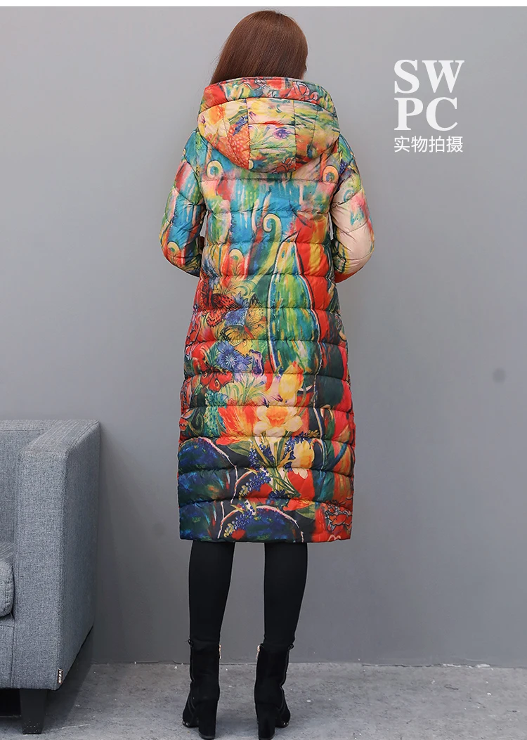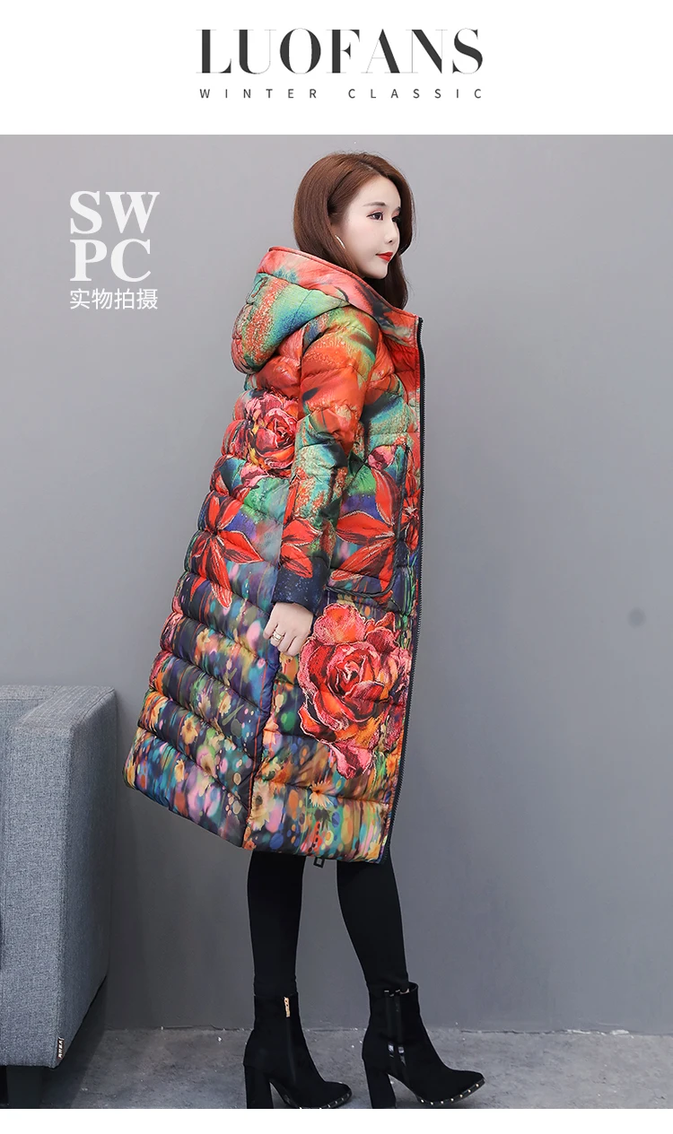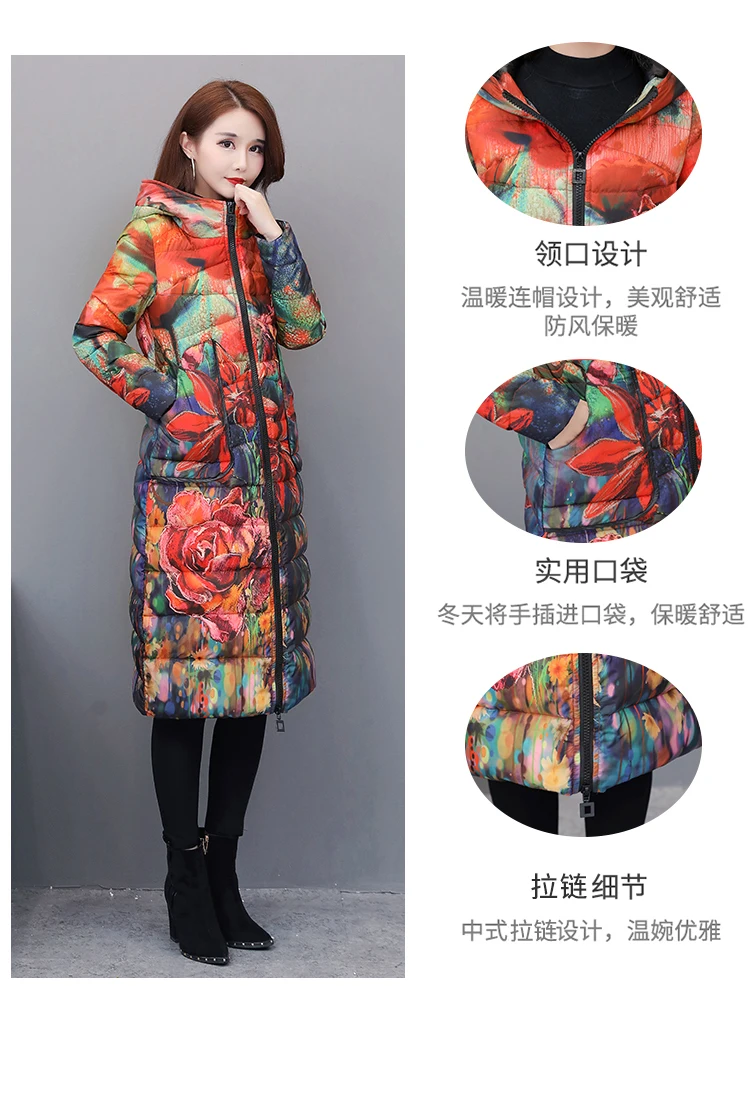 Женский пуховик, зимнее пальто с цветочным рисунком, длинная парка с капюшоном, 2021, 6XL, 1858