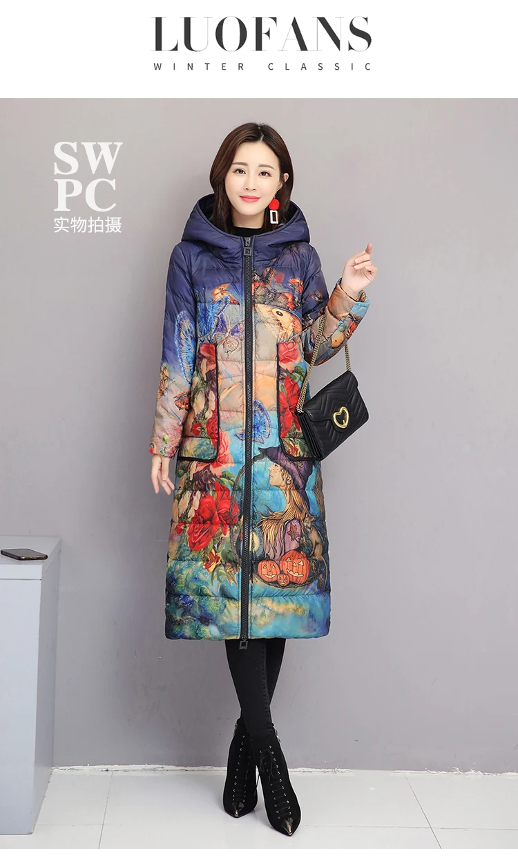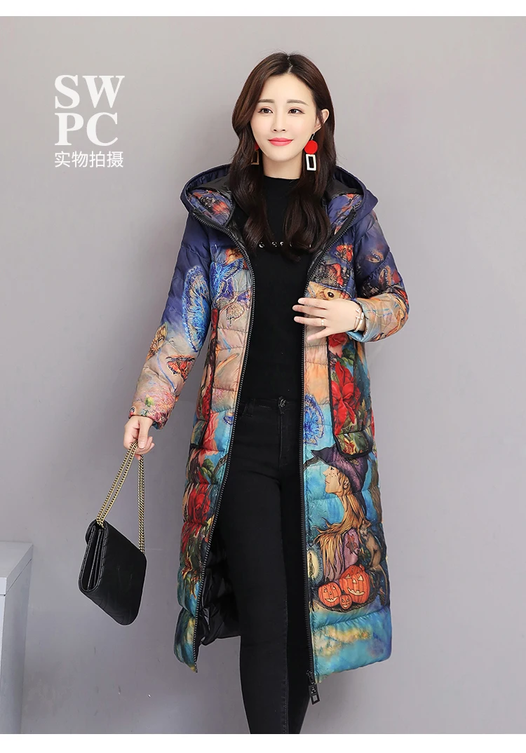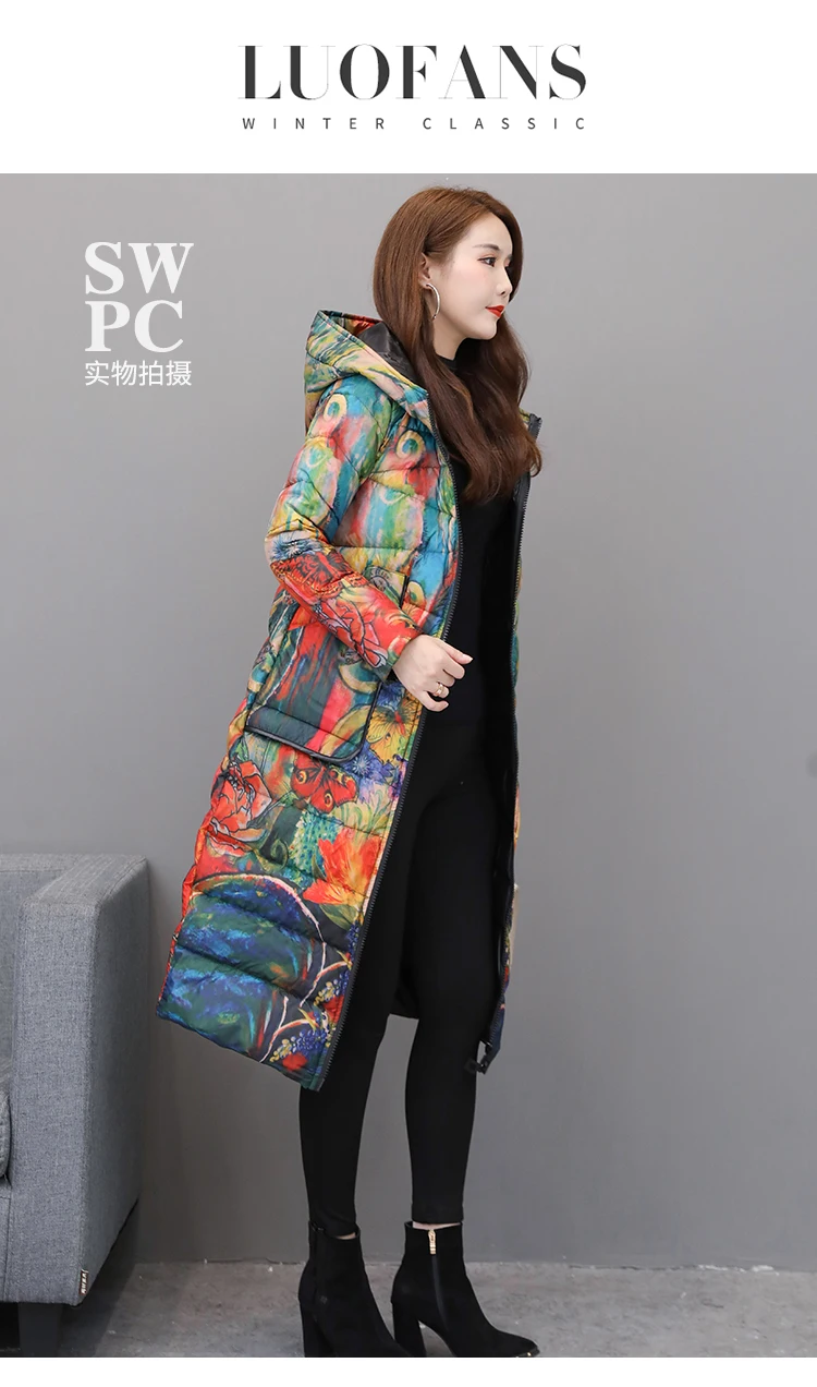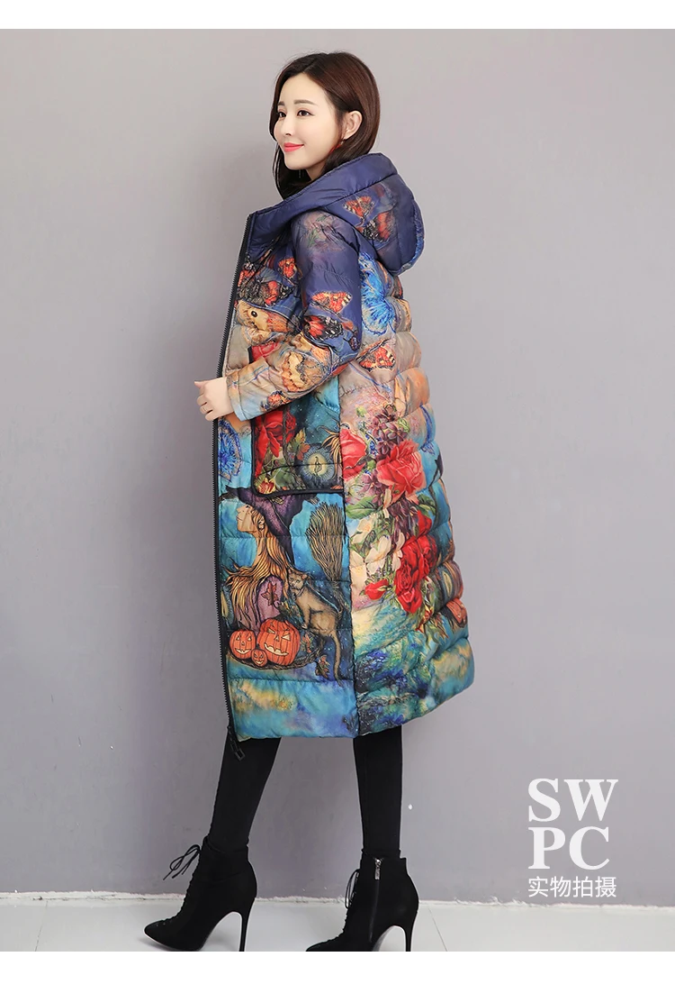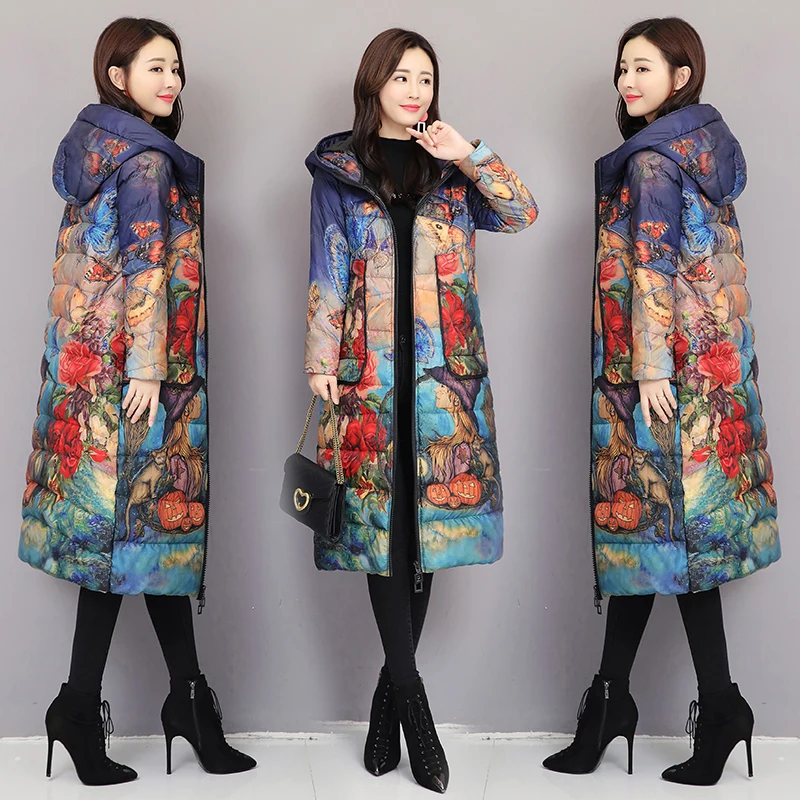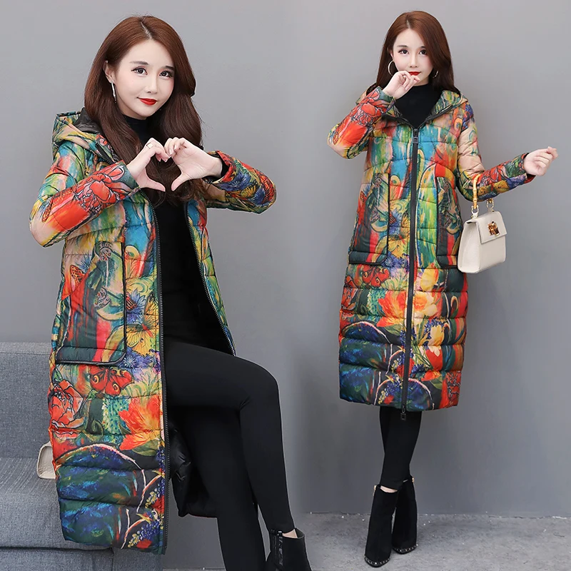 Женский пуховик, зимнее пальто с цветочным рисунком, длинная парка с капюшоном, 2021, 6XL, 1858