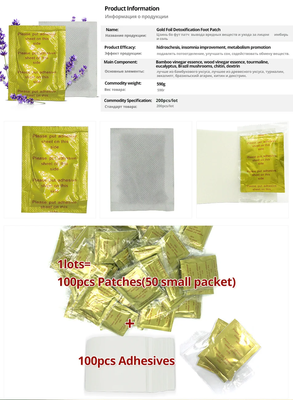 1 партия = 400 шт. = 200 шт. пластырей (100 небольших упаковок) + 200 шт. клеящих материаловСостав: бамбуковый уксус, хитозан, декстрин, докудами, лист локата, турмалин, растительное волокно, витамин С и древесный уксус. Подушечки индивидуально обернуты для сохранения свежести.Преимущества ботинок для ног:Высвобождение нежелательных токсиновУвеличьте уровень энергииУменьшает боль, боли, головные боли и усталостьСнятие стрессаУлучшает обмен веществУлучшить ваше кровообращениеУлучшение потери весаПолностью сдержанный-работает во время снаПростой и простой в использованииУказания для использования:1. Нанесите пластырь Kinoki detox за час до кровати.2. Вымойте и высушите ноги или часть тела перед нанесением пластырей kinoki Detox.3. Возьмите один клейкий лист и Медленно снимите бумагу.3. Поместите ножную подкладку на клейкую поверхность, чтобы «положить клейкий лист на эту сторону» и поместите на подошву вашей стопы или на желаемую область другой части тела.(Носки можно носить при необходимости)4. Носите в течение 8-10 часов, затем удалите коврик.5. Протрите поверхность влажным полотенцем, пока оно не станет липким.6. Использованные пластыри будут выглядеть темно-зеленоватыми или сероватыми, так как они поглощают токсины и отходы от вашего тела.7. Продолжайте использовать каждую ночь до тех пор, пока не исчезнет обесцвечивание подкладки.8. При использовании пластырей kinoki появляются признаки осветления, применяйте один или два раза в неделю для обслуживания.Предостережения: Не надевайте рану. Если у вас аллергия, не используйте эти подушечки. Этот продукт не предназначен для диагностики или лечения любых заболеваний. Если у Вас возникли какие-либо заболевания, обратитесь к врачу.