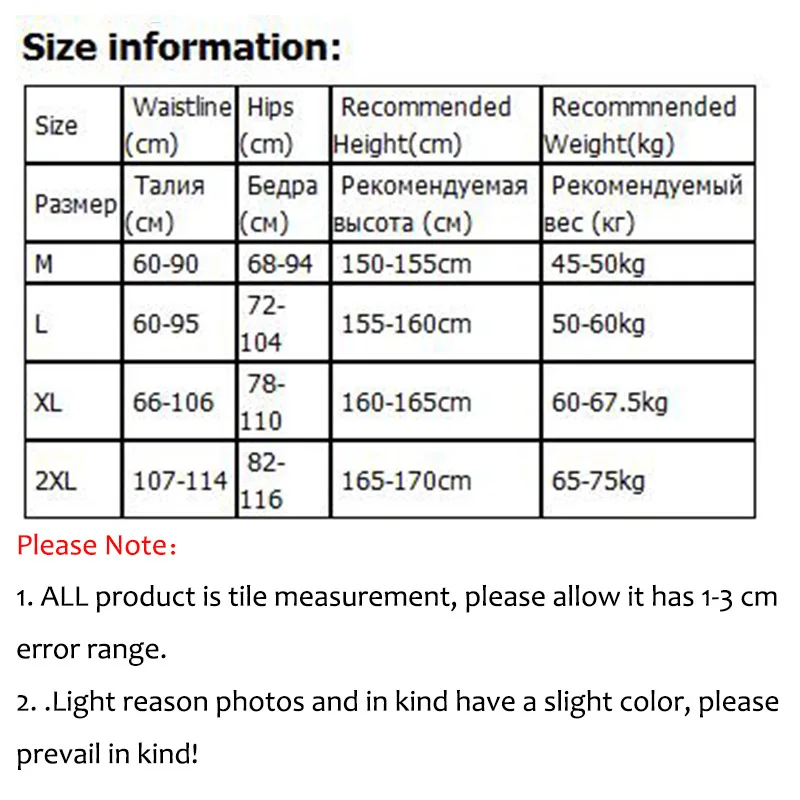 Размеры Талия (см) Бедра (см) Рекомендуемая высота (см) Вес (кг) Размер Талия (см) Бедра (см) Детская одежда (см) Детский костюм (кг) М 60-90 68-94 150-155 см 45-50 кг L 60-95 72-104 155-160 см 50-60 кг XL 66-106 78-110 160-165 см 60-67,5 кг 2XL 107-114 82-116 165-170 см 65-75 кг Обратите внимание: 1. Все продукты являются измерениями плитки, пожалуйста, учитывайте погрешность в 1-3 см. 2. Пожалуйста, при покупке выбирайте размер в соответствии с таблицей размеров. Если вы не понимаете их, пожалуйста, свяжитесь с нами. Сообщите нам вес и рост ваших детей. Мы поможем вам сделать лучший выбор. 3. Светильник причина фотографии и в натуральной форме, у вас есть s светильник цвет, просим отнестись к этому с пониманием!