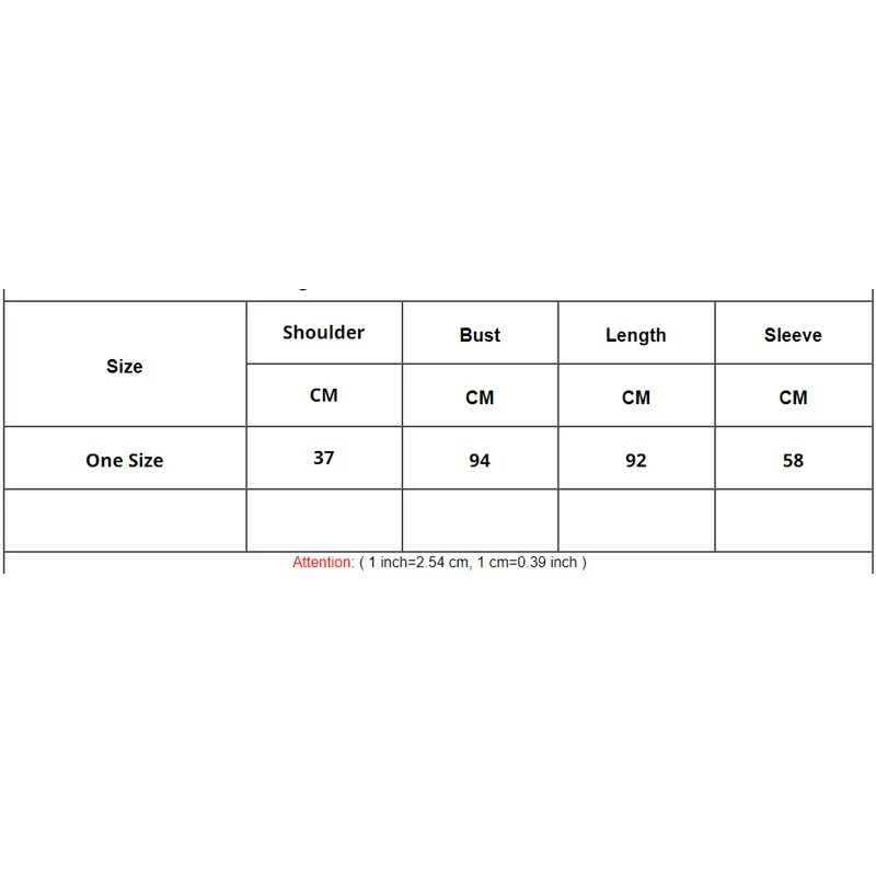 Один размер: длина 92 обхват груди 94 Рукав 58 Плечо 37