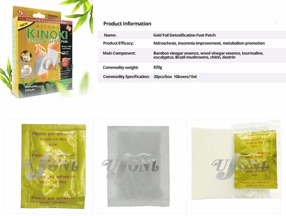 1 партия = 200 шт = 100 шт пластырей (50 небольших упаковок) + 100 шт клеевСостав: бамбуковый уксус, хитозан, декстрин, докудами, лист локата, турмалин, растительное волокно, витамин С и древесный уксус. Подушечки индивидуально обернуты для сохранения свежести.Преимущества ботинок для ног:Высвобождение нежелательных токсиновУвеличьте уровень энергииУменьшает боль, боли, головные боли и усталостьСнятие стрессаУлучшает обмен веществУлучшить ваше кровообращениеУлучшение потери весаПолностью сдержанный-работает во время снаПростой и простой в использованииУказания для использования:1. Нанесите пластырь Kinoki detox за час до кровати.2. Вымойте и высушите ноги или часть тела перед нанесением пластырей kinoki Detox.3. Возьмите один клейкий лист и Медленно снимите бумагу.3. Поместите ножную подкладку на клейкую поверхность, чтобы «положить клейкий лист на эту сторону» и поместите на подошву вашей стопы или на желаемую область другой части тела.(Носки можно носить при необходимости)4. Носите в течение 8-10 часов, затем удалите коврик.5. Протрите поверхность влажным полотенцем, пока оно не станет липким.6. Использованные пластыри будут выглядеть темно-зеленоватыми или сероватыми, так как они поглощают токсины и отходы от вашего тела.7. Продолжайте использовать каждую ночь до тех пор, пока не исчезнет обесцвечивание подкладки.8. При использовании пластырей kinoki появляются признаки осветления, применяйте один или два раза в неделю для обслуживания.Предостережения: Не надевайте рану. Если у вас аллергия, не используйте эти подушечки. Этот продукт не предназначен для диагностики или лечения любых заболеваний. Если у Вас возникли какие-либо заболевания, обратитесь к врачу.