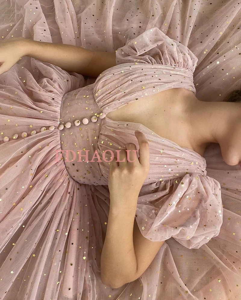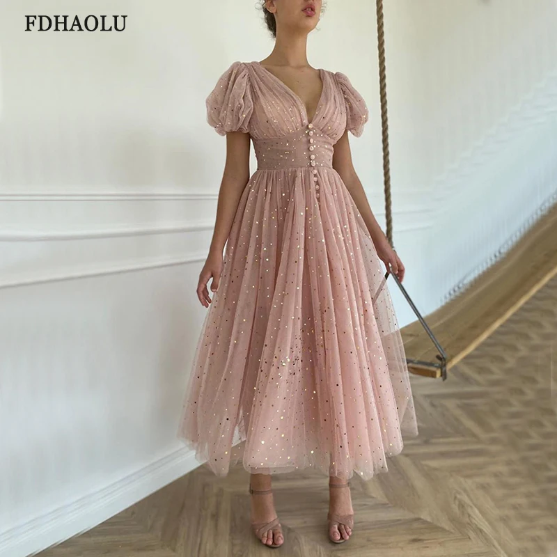 Платье вечернее Плиссированное из тюля, с V-образным вырезом и пышными рукавами