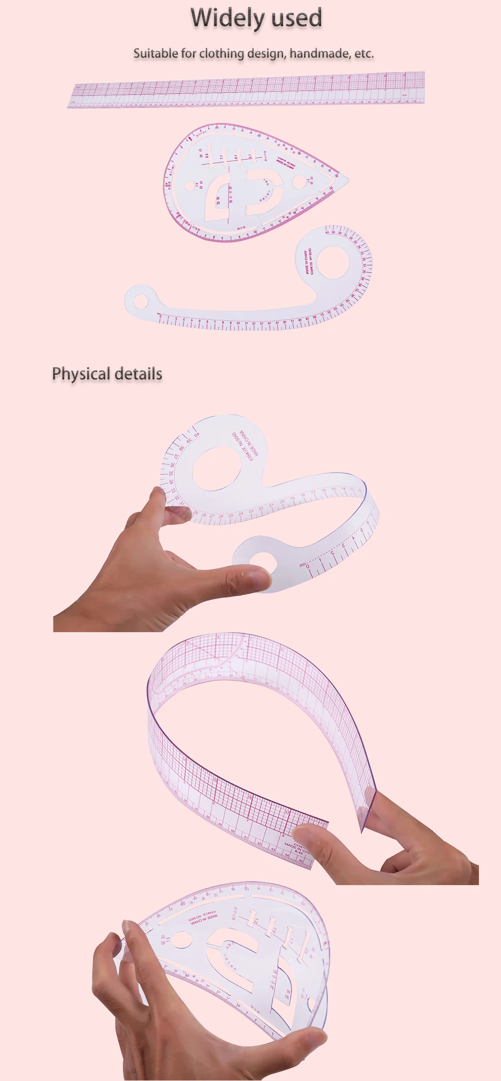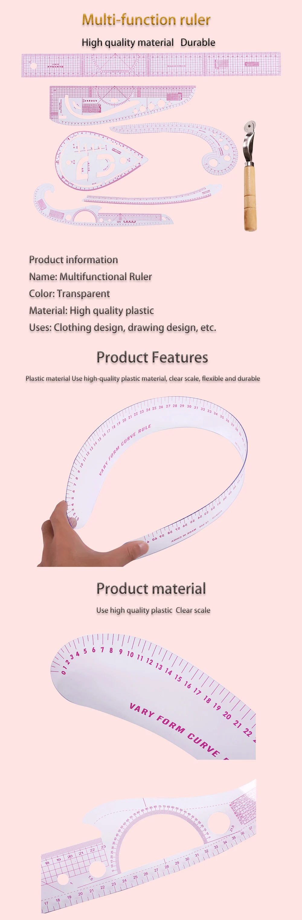 Линейка изготовлена из высококачественного пластика, тонкая и гибкая, встроенная, прочная, масштаб не легко носить.