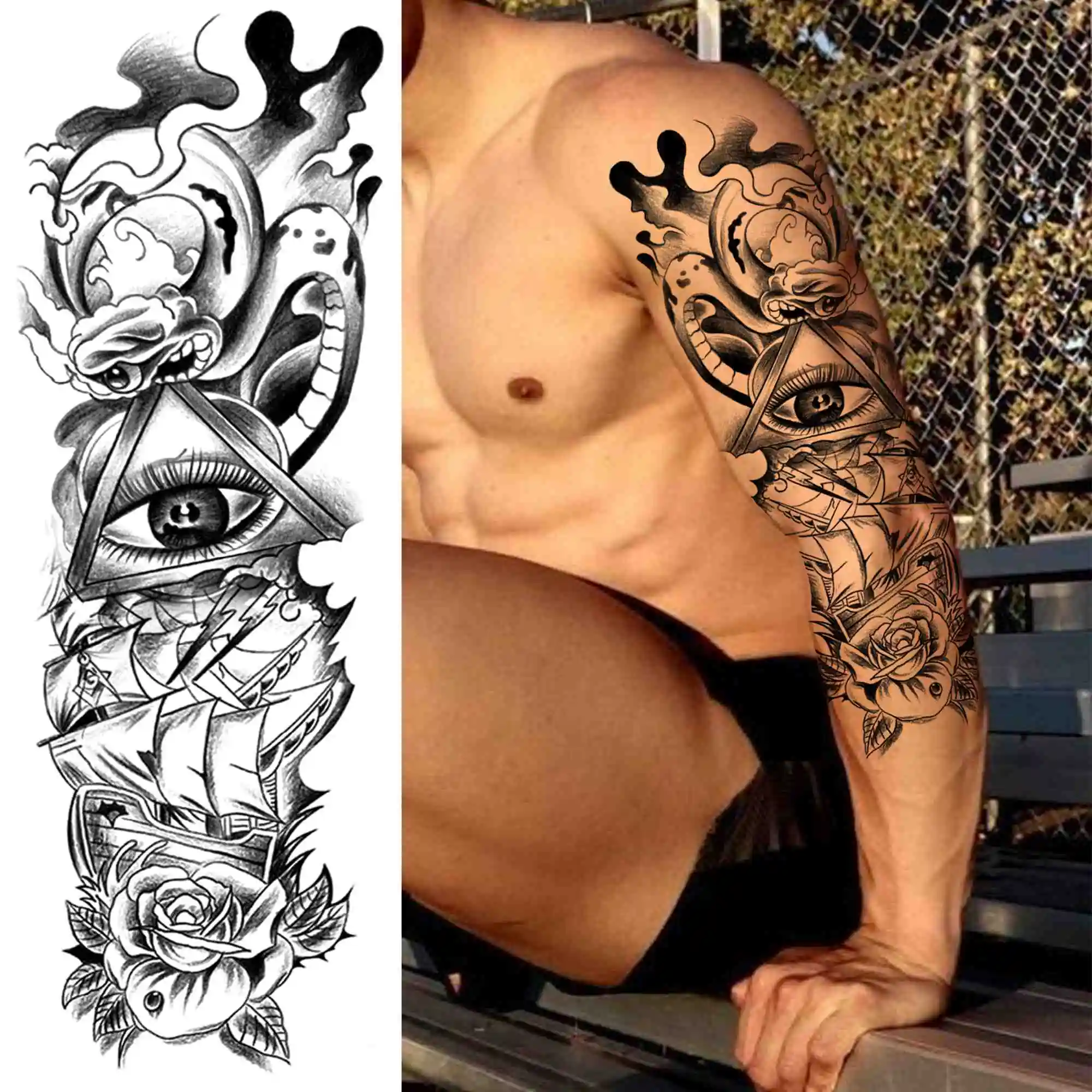 С цветочным принтом воина временная татуировка рукав для мужчин и женщин с имитацией черного цвета в виде геометрических фигур стикер татуировки глаз рукавом племенной полные руки татуировки