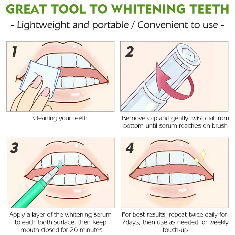 GREATTOOLTO WHITENINGTEETH-Легкий и портативный/удобный в использовании-1 Очистка зубов2. Снимите колпачок и аккуратно скрутите đснизу, пока сыворотка не достигнет кисти3 Нанесите слой отбеливающей сыворотки на поверхность каждого зуба, затем держите рот закрытым в течение 20 минут4. Для достижения наилучших результатов Повторите два раза в день в течение 7 дней, а затем используйте по мере необходимости для еженедельного касания