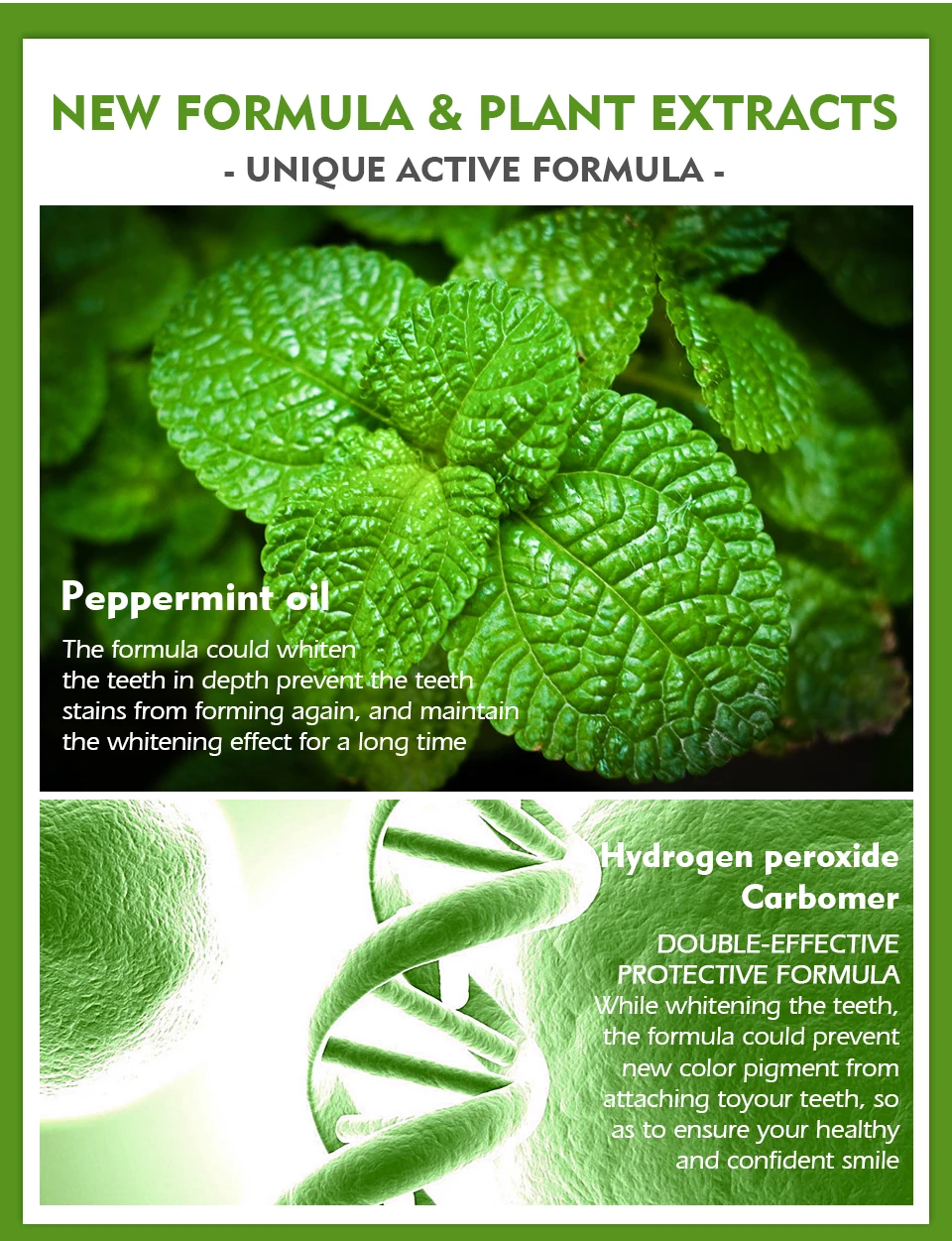 . Уникальная активная формула.PeppermintoilФормула может отбеливать зубы в глубине, предотвращая повторное образование пятен зубов, и поддерживать отбеливающий эффект в течение длительного времениПерекись водородаCarbomerDOUBLE-EFFECTIVEPROTECTIVE формулы при отбеливании зубов, формула может предотвратить новый цветной пигмент от присоединения к вашим зубам, чтобы обеспечить вашу здоровую и уверенную улыбку
