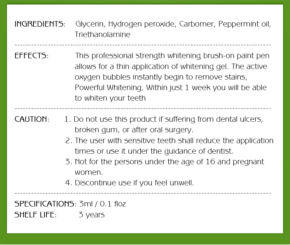 Состав: глицерин, перекись водорода, карбомер, масло перечной мяты, триэтаноламинЭффекты: эта профессиональная отбеливающая щетка-ручка для краски обеспечивает тонкое нанесение отбеливающего геля. Пузырьки activeoxygen начинают удалять пятна, мощное отбеливание. Всего за 1 неделю вы можете отбелить зубыВнимание: 1. Не используйте этот продукт, если он страдал от язв зубов, поломки десен или после оральной хирургии.2. Пользователь с чувствительными зубьями должен уменьшить время применения или использовать его под руководством стоматолога.3. Не для лиц в возрасте до 16 лет и беременных женщин.4. Прекратите использование, если вы чувствуете себя плохо.Характеристики: 3mI/O.1 flozСрок годности: 3 года