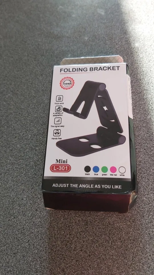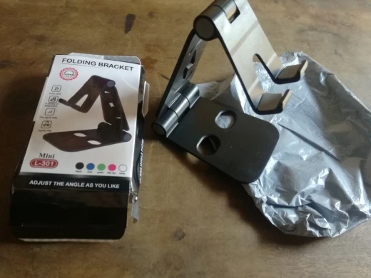 Doosje kwam ingedeukt aan, maar de telefoon houder is onbeschadigd. Hij is licht van gewicht en goed in te stellen op verschillende standen en blijft ook goed in de stand staan. Aanrader!!!
