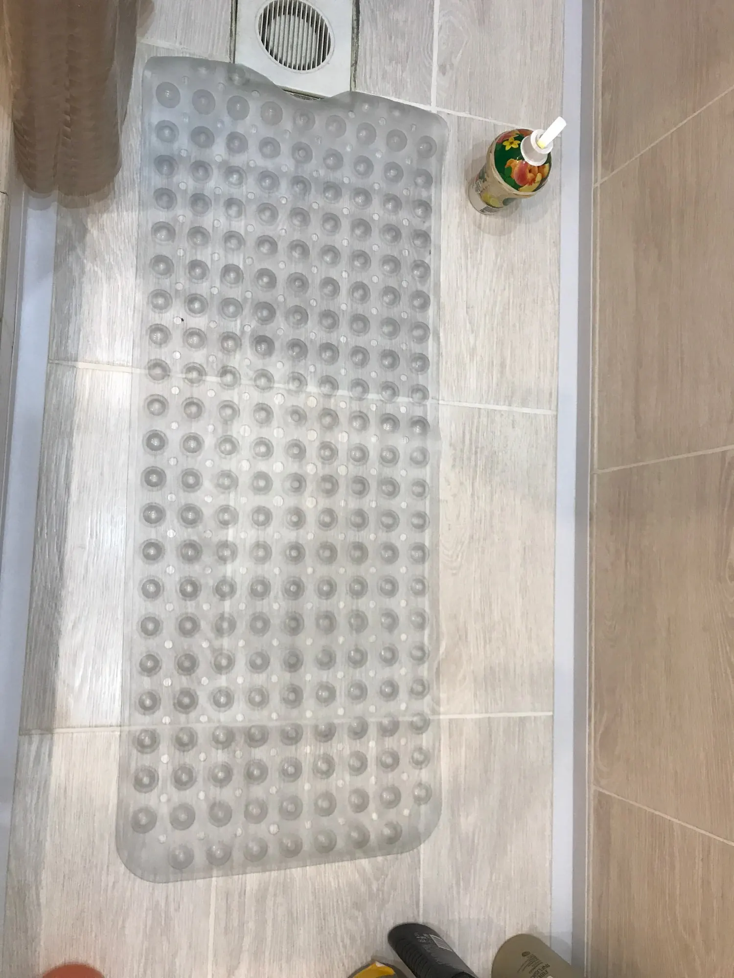 Не скользит. Длинный на всю ванну. Присоски хорошо держатся