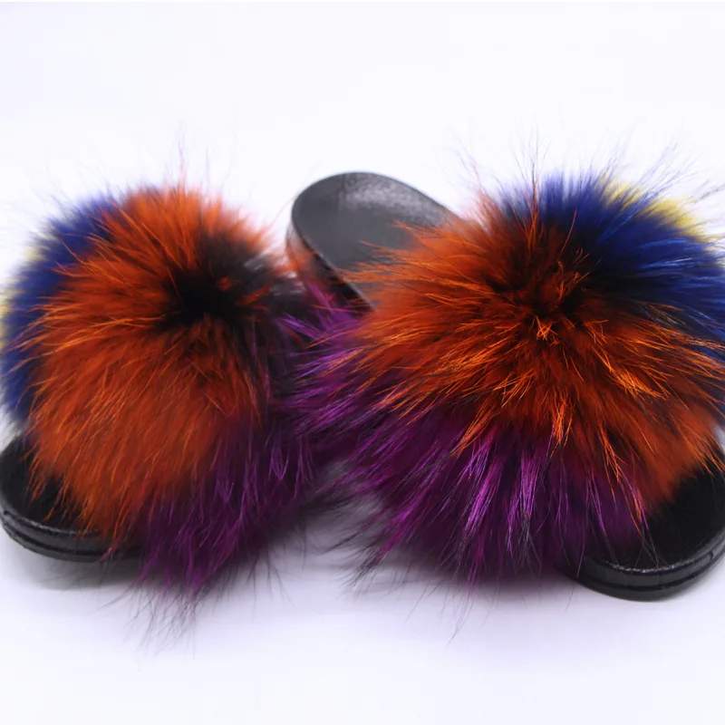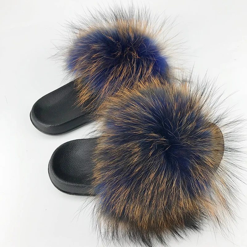 Пушистые тапочки; Женская обувь; Домашние шлепанцы с натуральным лисьим мехом; Женские меховые шлепанцы; Домашние женские сандалии с мехом енота