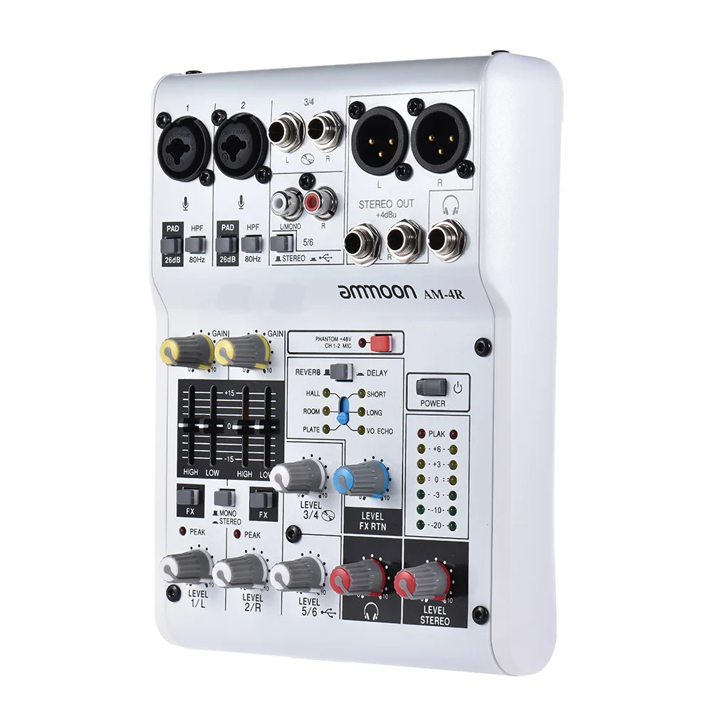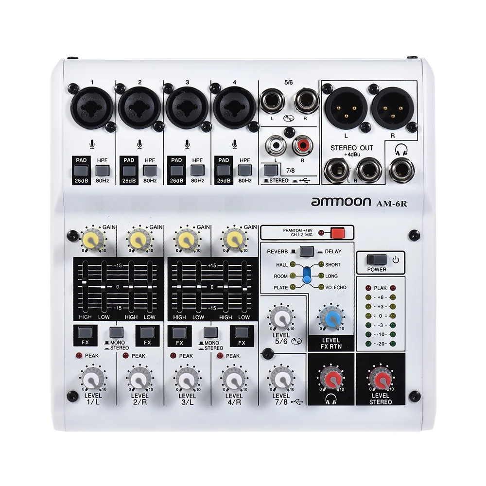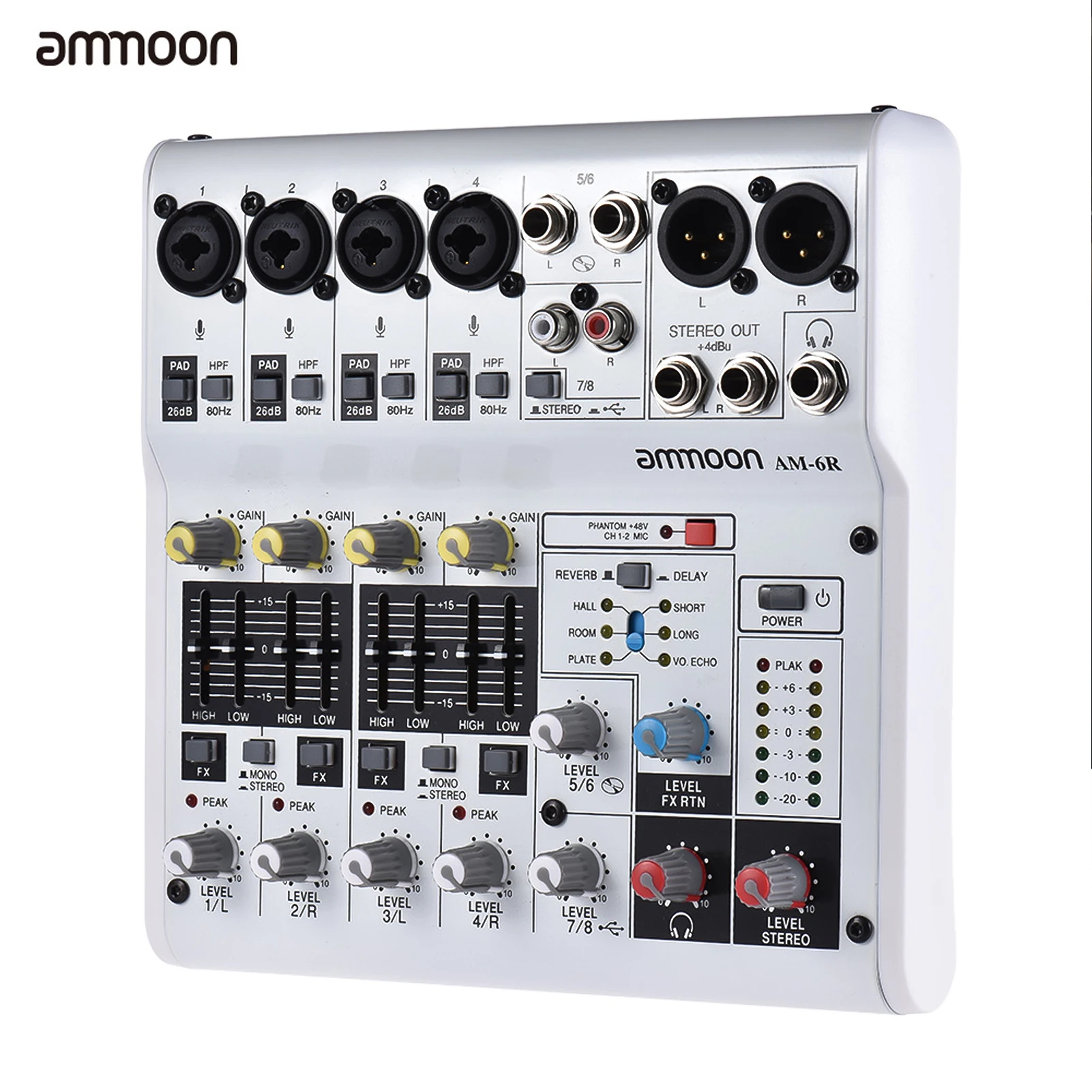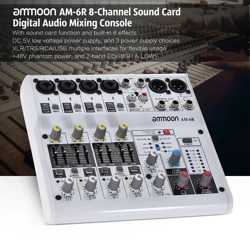Особенности:8-канальный микшерный пульт, может быть подключен к вашему компьютеру через USB 2,0 интерфейс для воспроизведения музыки, но не может записывать.Низковольтный источник питания 5 в постоянного тока и 3 варианта питания: блок питания 5 В (не входит в комплект), адаптер питания, интерфейс USB 2,0.С микрофоном/линейными входами (4), 1/4 "TRS стерео входами (L & R) и RCA стерео входами (L & R) для подключения микрофонов, инструментов или других устройств аудиовхода.Характеристики XLR выходов (L & R), 1/4 "TRS стерео выходов (L & R) и 1/4" TRS выход наушников для подключения динамиков или наушников для мониторинга аудиовыхода.Встроенные 6 эффектов (зал, комната, тарелка, короткая, длинная, VO.ECHO), что делает ваше пение более мощным и профессиональным.Другое Особенности: + 48В, 2-полосным эквалайзером (испытание на устойчивость к высокой и низкой), в качестве основной и индивидуальный регулятор громкости, подойдет как для повседневной носки, так/переключатель стереосистемы, PAD и HPF кнопка и т. д. Характеристики:Бренд: ammoonМодель: AM-6RИсточник питания: 5 В постоянного токаАдаптер питания: штепсельная вилка европейского стандарта, входное напряжение 100-240 ВРазмер изделия: 20,5*20*6 см/8,1*7,9 * 2.4inВес изделия: 1050 г/2.3lbПосылка: 27*24*12 см/10,6*9,4*4,7 дюймовПосылка Вес: 1600g / 3.5lb Примечание:Микшерная консоль не поддерживает функцию звуковой карты. Посылка:1 * микшерный пульт1 * USB кабель (около 1,5 м)1 * USB кабель питания (около 70 см)1 * Адаптер питания1 * Руководство пользователя (на английском языке)
