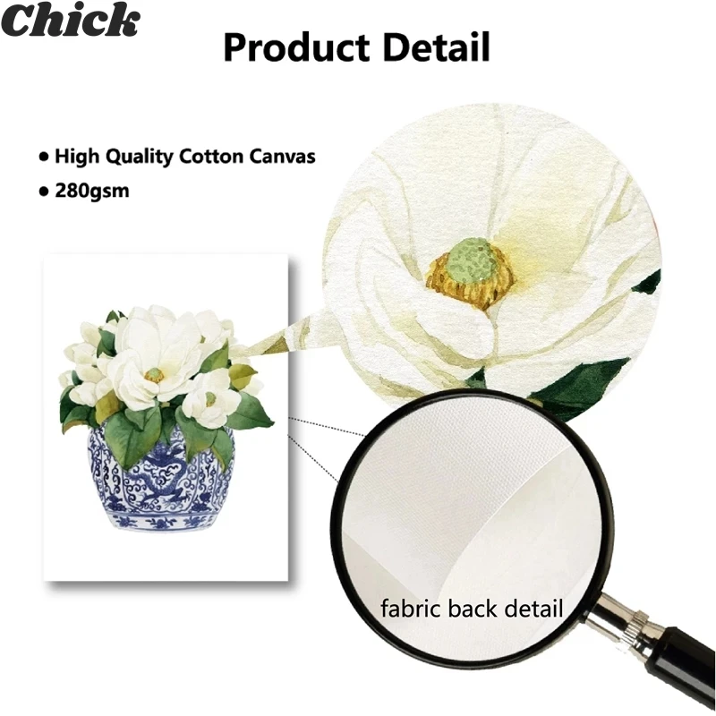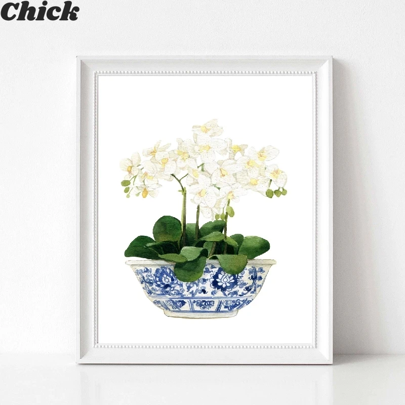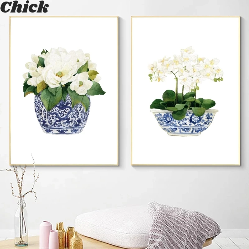 Белая орхидея и Магнолия, акварель, китайский стиль, Декор, холст, печать, Восточная ваза, синяя белая ива, стиль фарфора, фотография