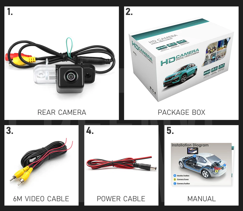 1. Задняя камера2. Коробка для посылка3. Видео кабель (6 м)4. Кабель питания5. Руководство пользователя