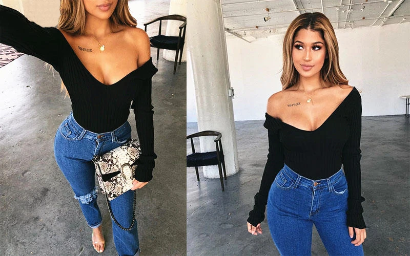 Соблазнительное черное боди с глубоким V-образным вырезом, боди с открытыми плечами, эластичные боди с длинным рукавом, женская рубашка, боди-комбинезон на осень и зиму, боди, одежда