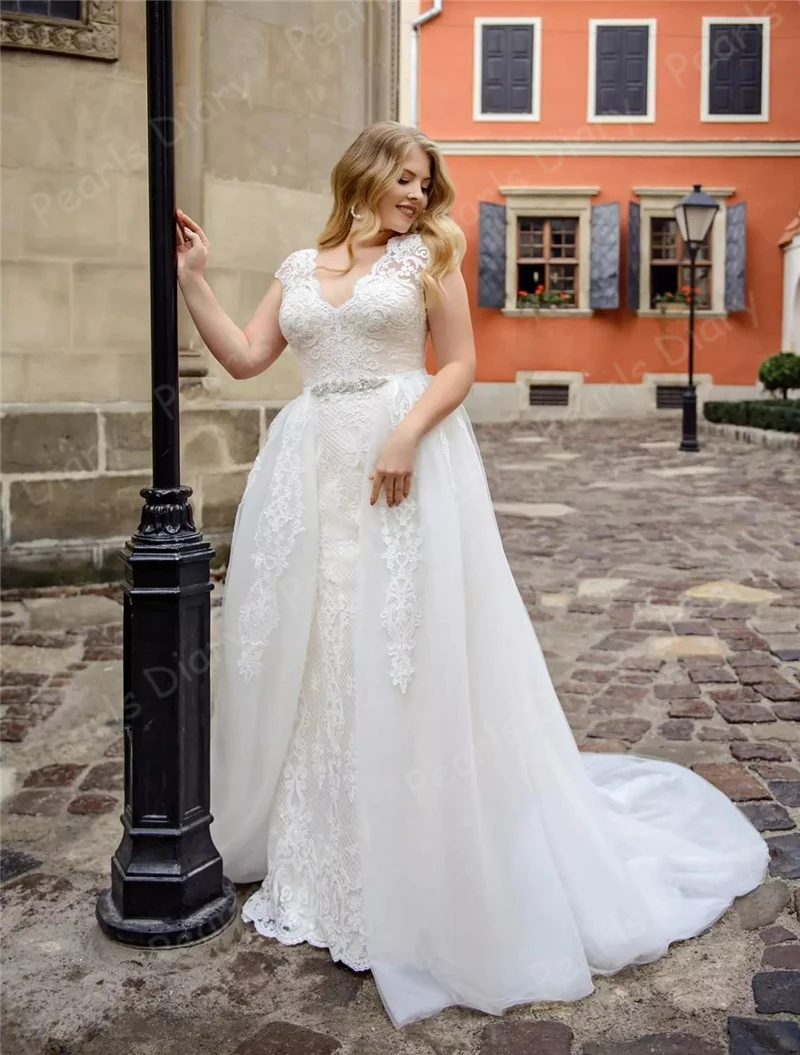 2021 высокое качество детское платье силуэта русалка с v-образным вырезом Свадебные платья со съемным шлейфом Свадебные платья Vestido De Noiva полный аппликацией; Обувь под свадебное платье для невесты