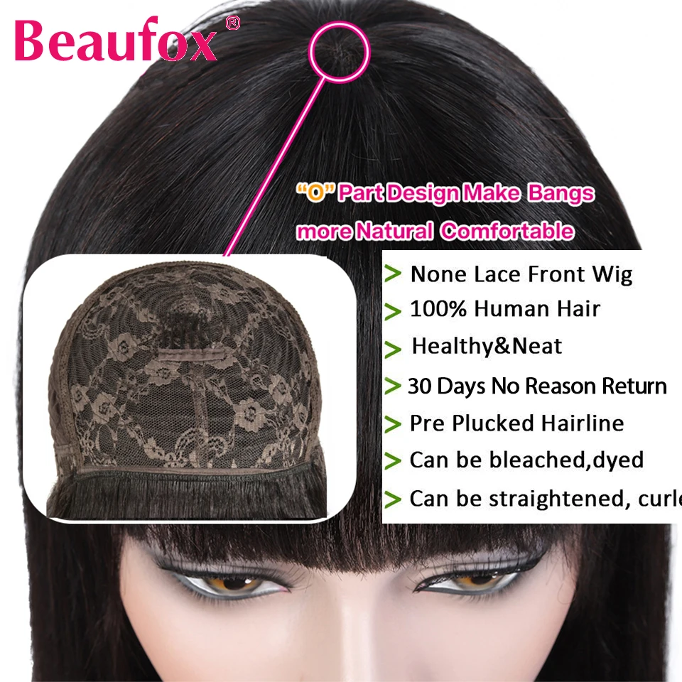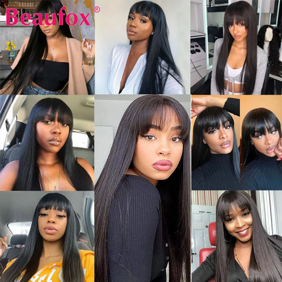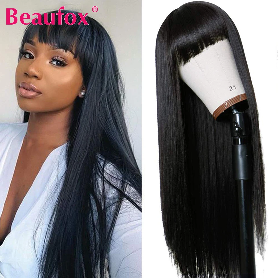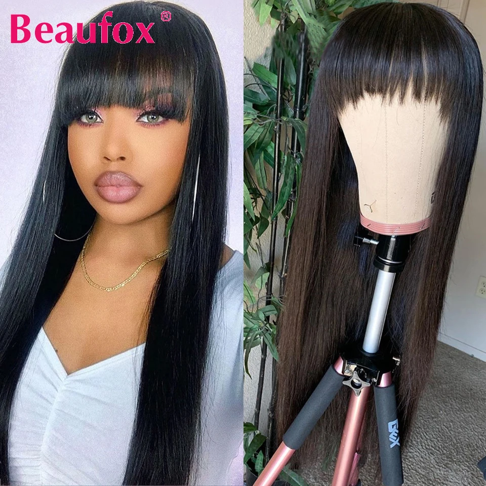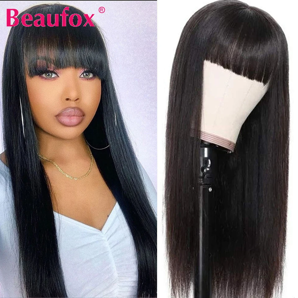 Индийские прямые парики Beaufox из человеческих волос с челкой, парики из человеческих волос Remy для женщин, безклеевые Необработанные индийские парики, парики полностью машинной работы