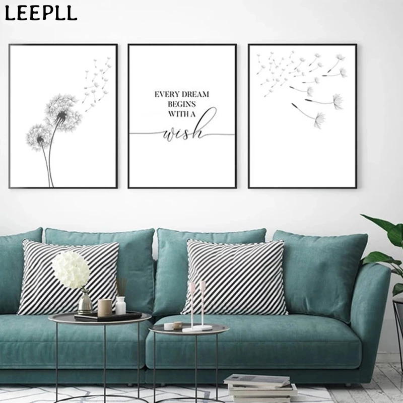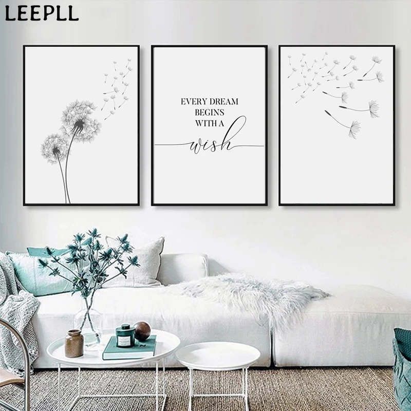 Черно-белый плакат с перьями одуванчика и печатные буквы настенная ...
