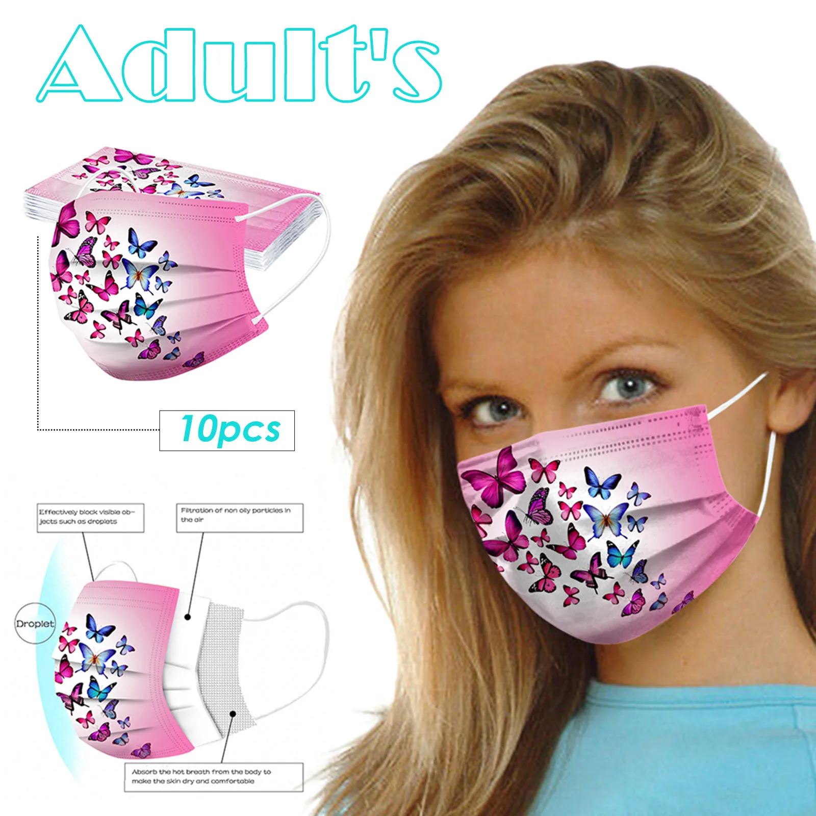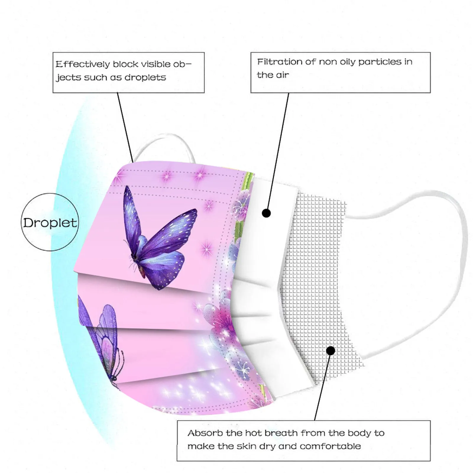 В Одноразовая маска изготовлена из 3 слоев нетканого материала, Безопасен и безопасен для использования. Дышащий материал и красивый Узоры, которые делают его полезным и модным. Специальный 3 слоя из нетканого материала Дизайн, обеспечивает некоторую защиту от пыли, автомобильных выхлопных газов, Пыльца и т. д. эластичная Ушная петля, легко носить и не давит на уши.