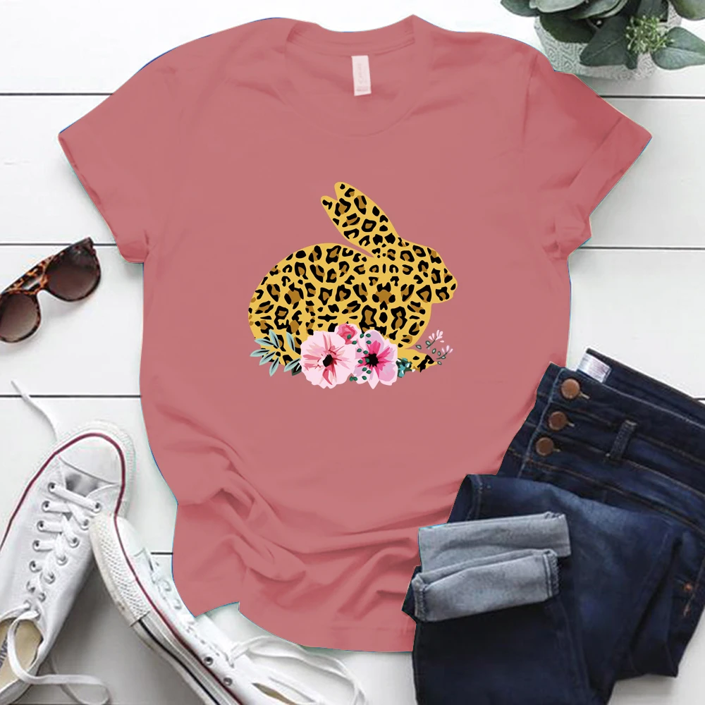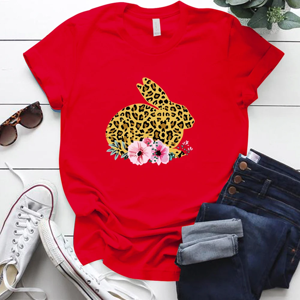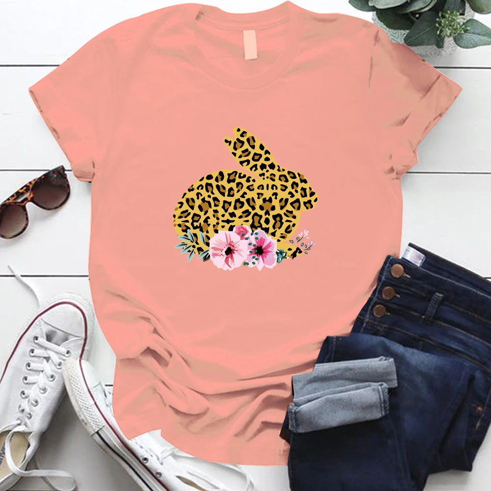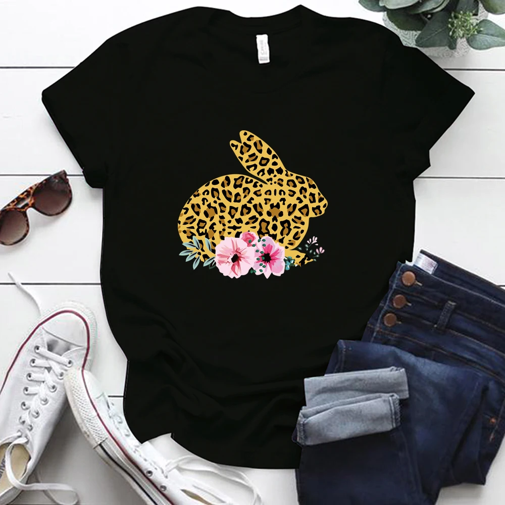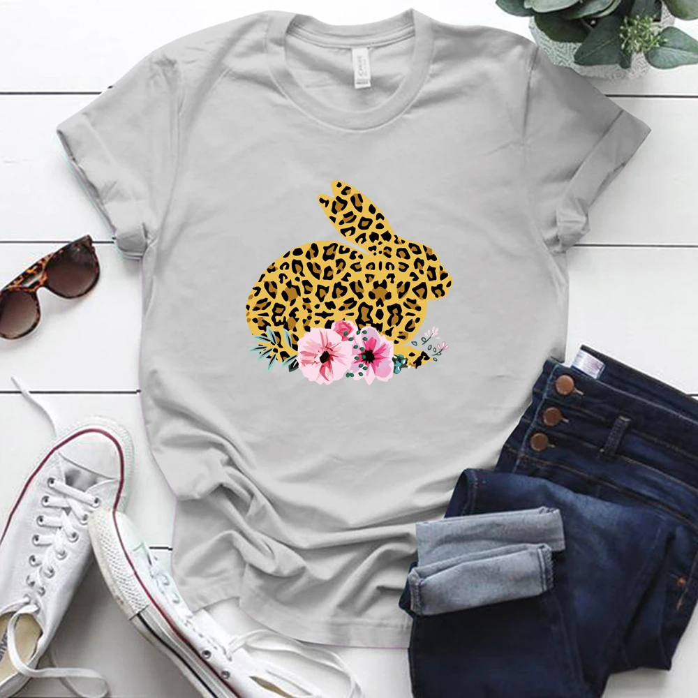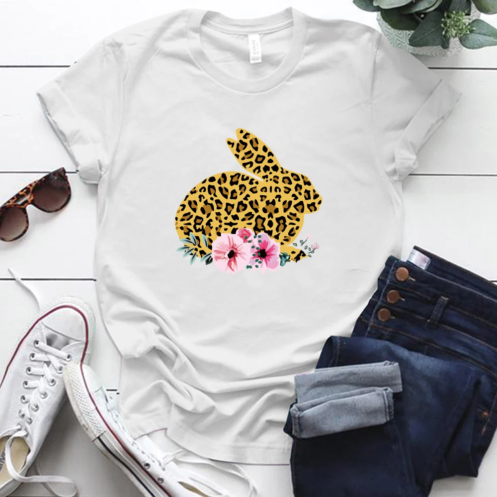 На пасхальную тему с изображением кролика и леопардовой расцветки с принтом кролики, Harajuku футболки для женщин; Большие размеры S-5xl Праздничная футболка Street Стиль в винтажном стиле Coton Y2k Топы