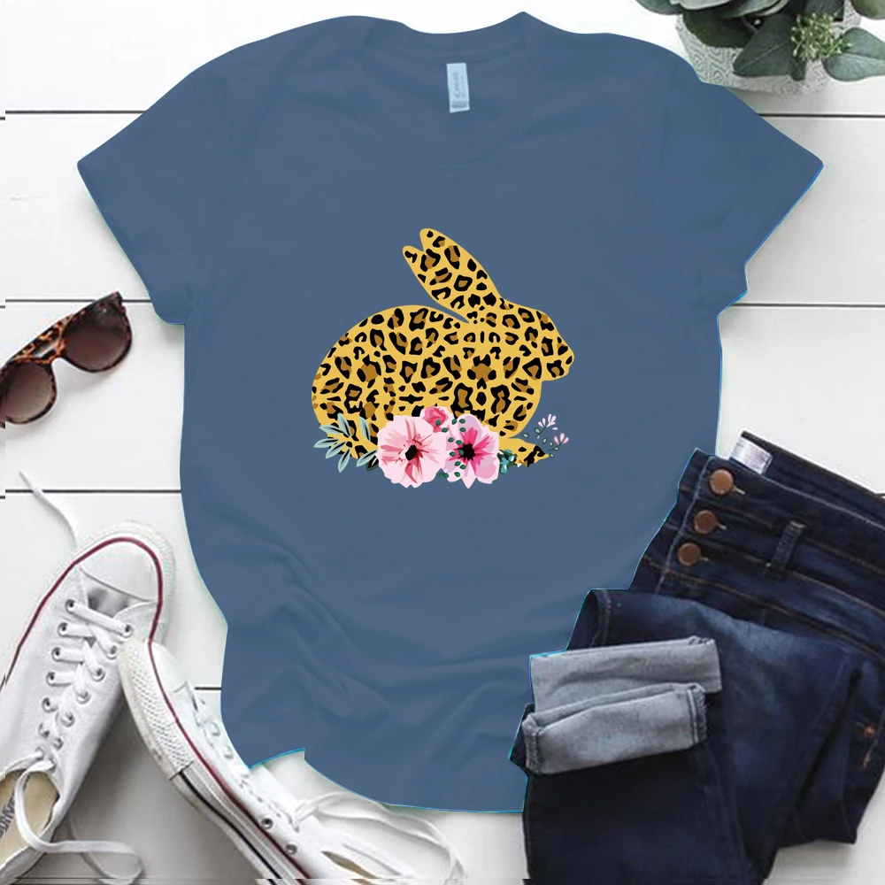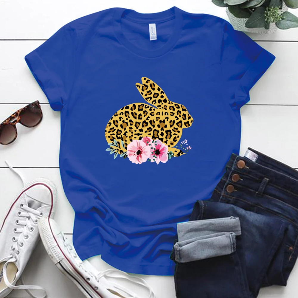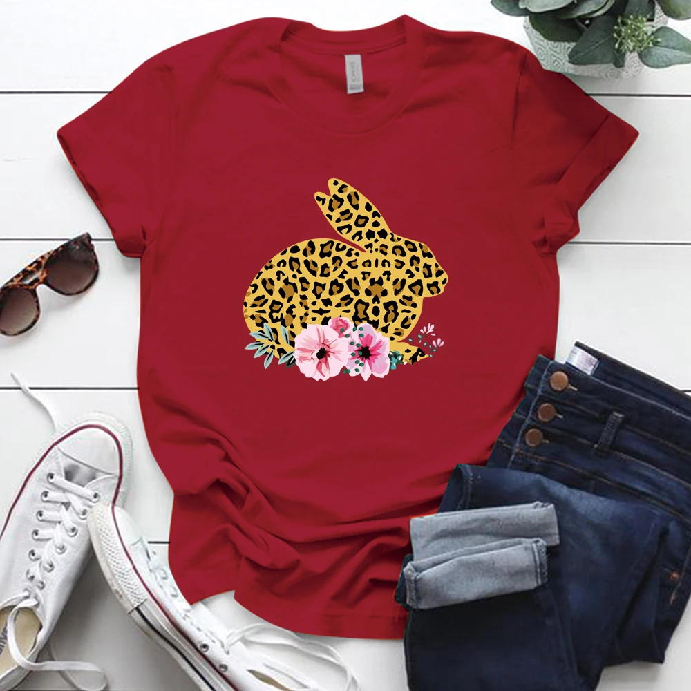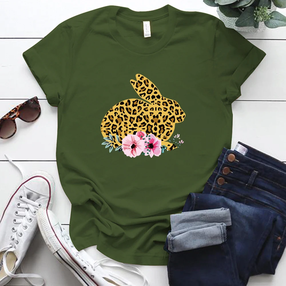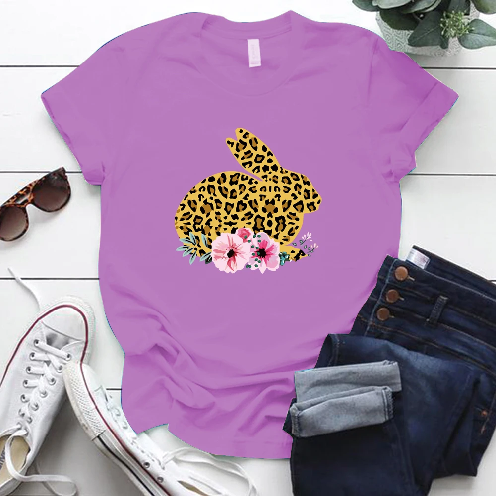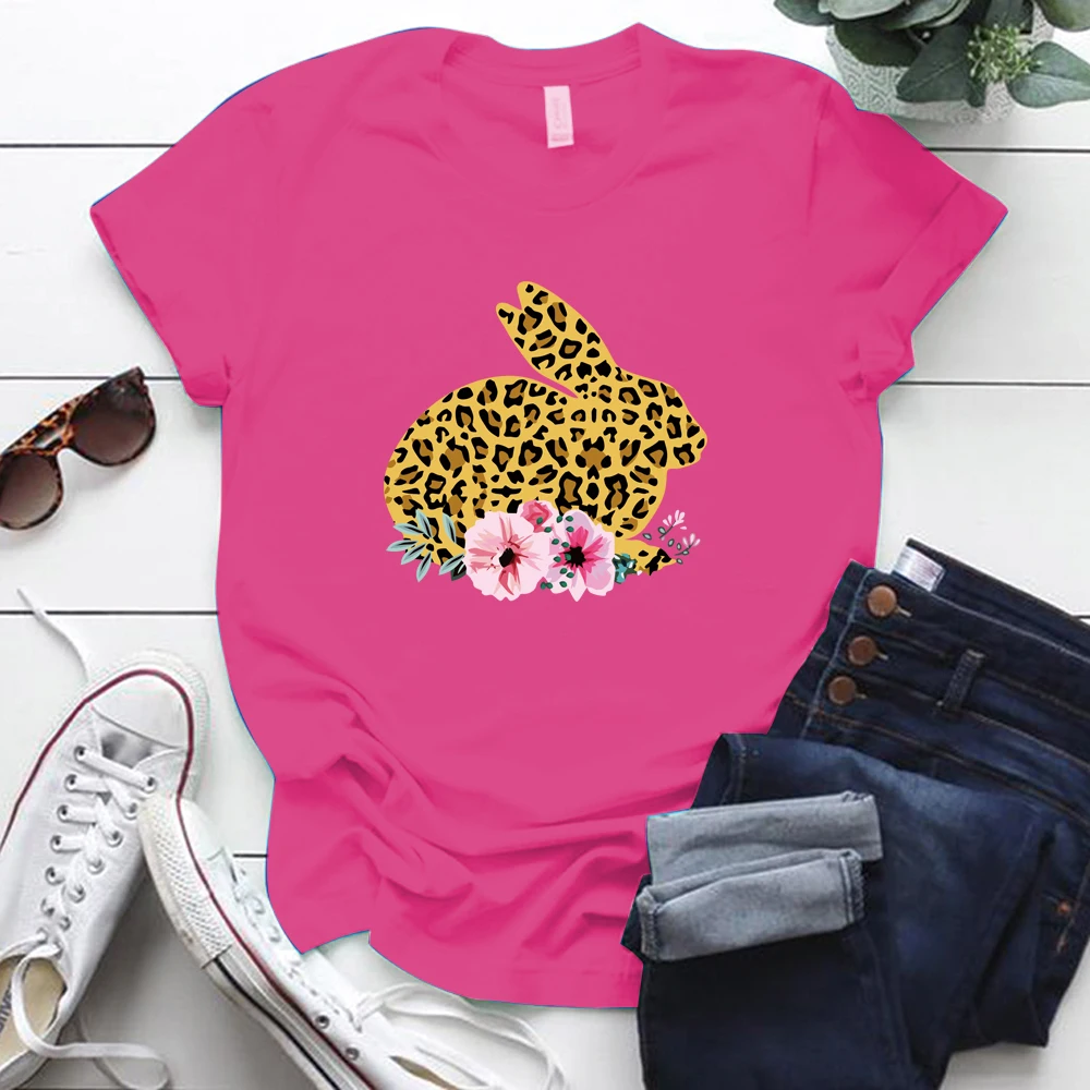 На пасхальную тему с изображением кролика и леопардовой расцветки с принтом кролики, Harajuku футболки для женщин; Большие размеры S-5xl Праздничная футболка Street Стиль в винтажном стиле Coton Y2k Топы