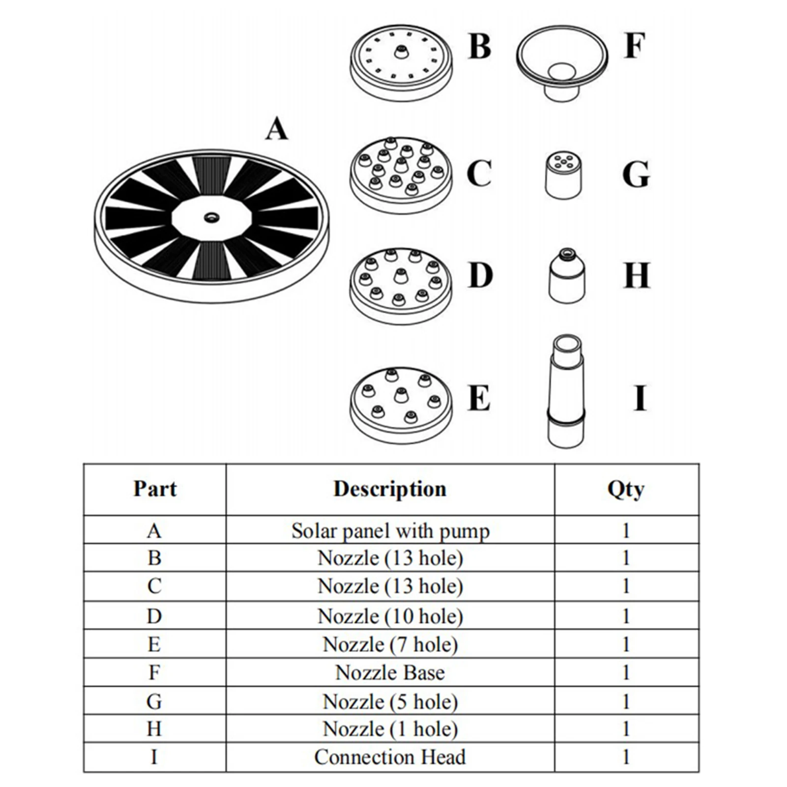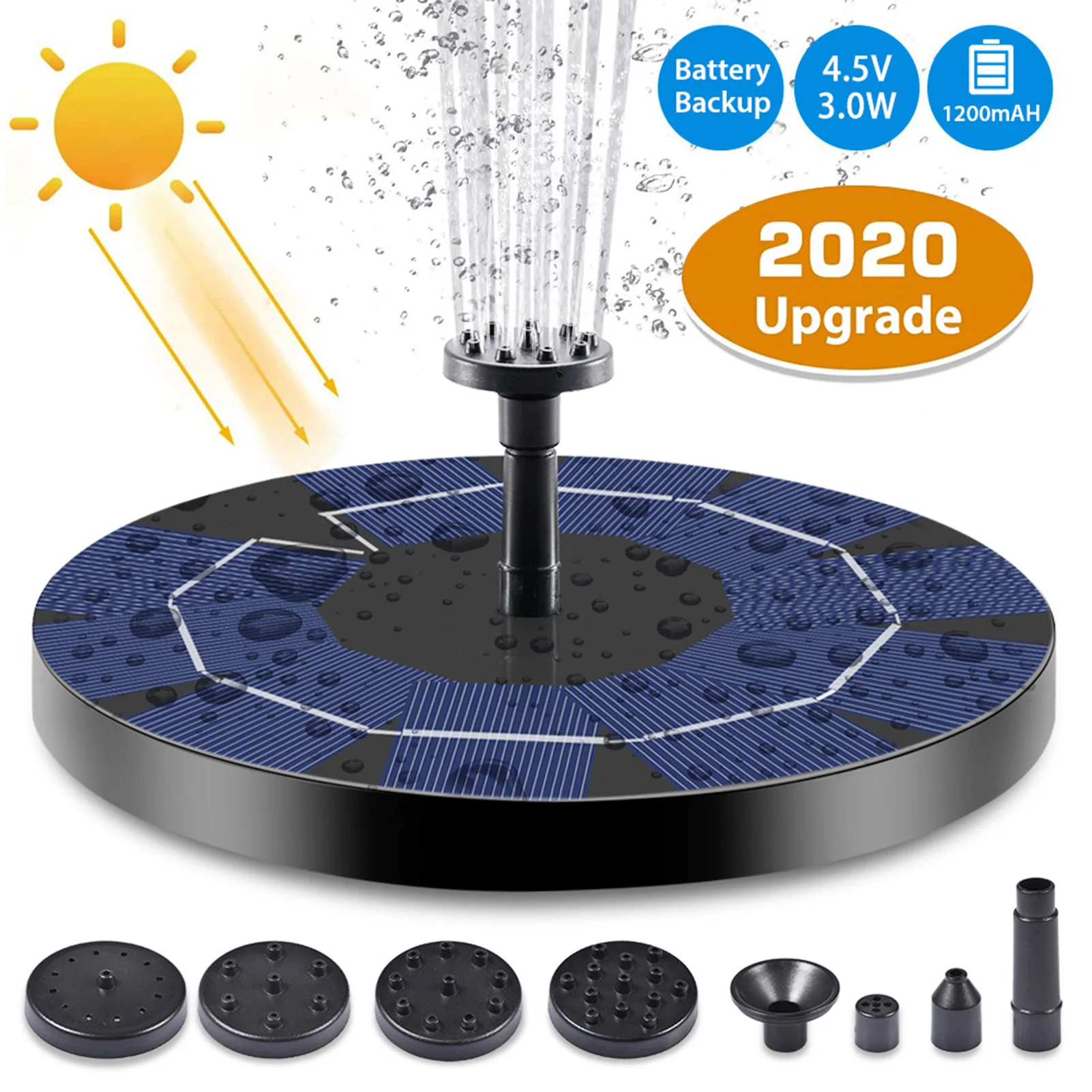 Особенности:1. Солнечный фонтан 5 В, 3,5 Вт: солнечный фонтан «Птичье гнездо» может работать автоматически под прямыми солнечными лучами всего за 3 секунды; Фонтан поставляется с аккумуляторной батареей. Работает даже в пасмурные дни. Высота распыления воды составляет около 80 см/31,50 дюйма. Не требуется питание или батарея.2. Простая установка: Просто поместите водяной насос в воду, солнечная панель подвержена воздействию солнечного света, фонтан автоматически распыляет воду в течение 3 секунд. Никаких инструментов не требуется. Совершенно беззаботно.3. Многоразовое Использование: этот новый тип фонтана с солнечным насосом отлично подходит для гнезд птиц, аквариумов, небольших прудов, бассейнов, садов, террас, газонов и циркуляции кислорода. Принесет вам больше радости.4. Рекомендации по использованию: сохраняйте достаточное количество воды и держите воду, панель и насос в чистоте, чтобы на панели не было теней или блокировки насоса. Чем сильнее солнечный свет, тем лучше эффект фонтана.5. Настройте функцию защиты от нехватки воды (контроль уровня воды): Когда вода отсутствует, насос автоматически перестанет работать для защиты двигателя. Функция обнаружения света: автоматически перестает работать при обнаружении ночи.Спецификация:Мощность солнечной панели: 4,5 в, 3,0 ВтРазмер солнечной панели: около 180 мм/7,09 дюймаМощность насоса: 4,5 в, 1,0 ВтАккумулятор: перезаряжаемый литий-ионный 3,7 в, 1200 мАчМаксимальный расход насоса: 350 л/чМаксимальная головка насоса: 130 смМаксимальная высота распыления: 70 смСрок службы фонтана: ≥ 10000 часов.Срок службы батареи: зарядка и разрядка 300-500 раз.Задержка: ≤ 3 с (когда солнце восстанавливается).Время работы: солнечный, аккумулятор до 4-5 часов.Функция батареи: когда солнце слабое или погода плохая, солнечный фонтан работает от батареи. Солнечная панель имеет избыточную мощность.Обнаружение света: при обнаружении темноты фонтан перестанет работать.Защита от сухого хода: фонтан оснащен конденсатором уровня воды.Если нет воды, он перестанет работать.Сопло: 6 разных форсунок на ваш выбор.Важные советы:Держите поверхность солнечной панели чистой.Часто меняйте воду, чтобы предотвратить попадание грязи на насос.Поместите фонтан с солнечным насосом под безводным солнечным светом, аккумулятор будет заряжен, но солнечный фонтан не работает.Глубина и Чистота воды должна быть не менее 1 дюйма (2,5 см).Не используйте солнечные фонтаны, когда температура воды выше 113 ° F (45 ° C).Не используйте фонтан с солнечным насосом в грязной или агрессивной воде.Упаковочный лист:Солнечный фонтан с насосом × 1Сопло × 6Держатель сопла × 1Разъем × 1
