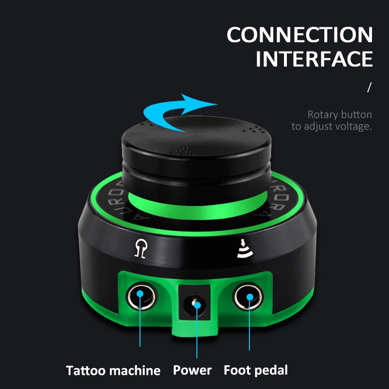 Цвет: серебристый/черный Размеры: диаметр 2-7/8 дюйма, высота 1-3/4 дюйма Вес: 6,4 унций Выходное напряжение: 1,5 В-16 В Совместим со всеми катушками и вращающимися тату-машинами Удобная ручка поворотного управления для включения/выключения, переключения режимов и изменения напряжения Индикатор изменения цвета напряжения Два режима ножной педали-поддерживается или мгновенно Функция режима запуска для вращающихся тату-машинок 1/4 "моно Джек входы для стандартного Зажима Шнура и ножной педали (ножная педаль не требуется для запуска) Корпус из анодированного алюминия с ЧПУ Встроенные магниты и силиконовые ручки позволяют использовать на различных поверхностях
