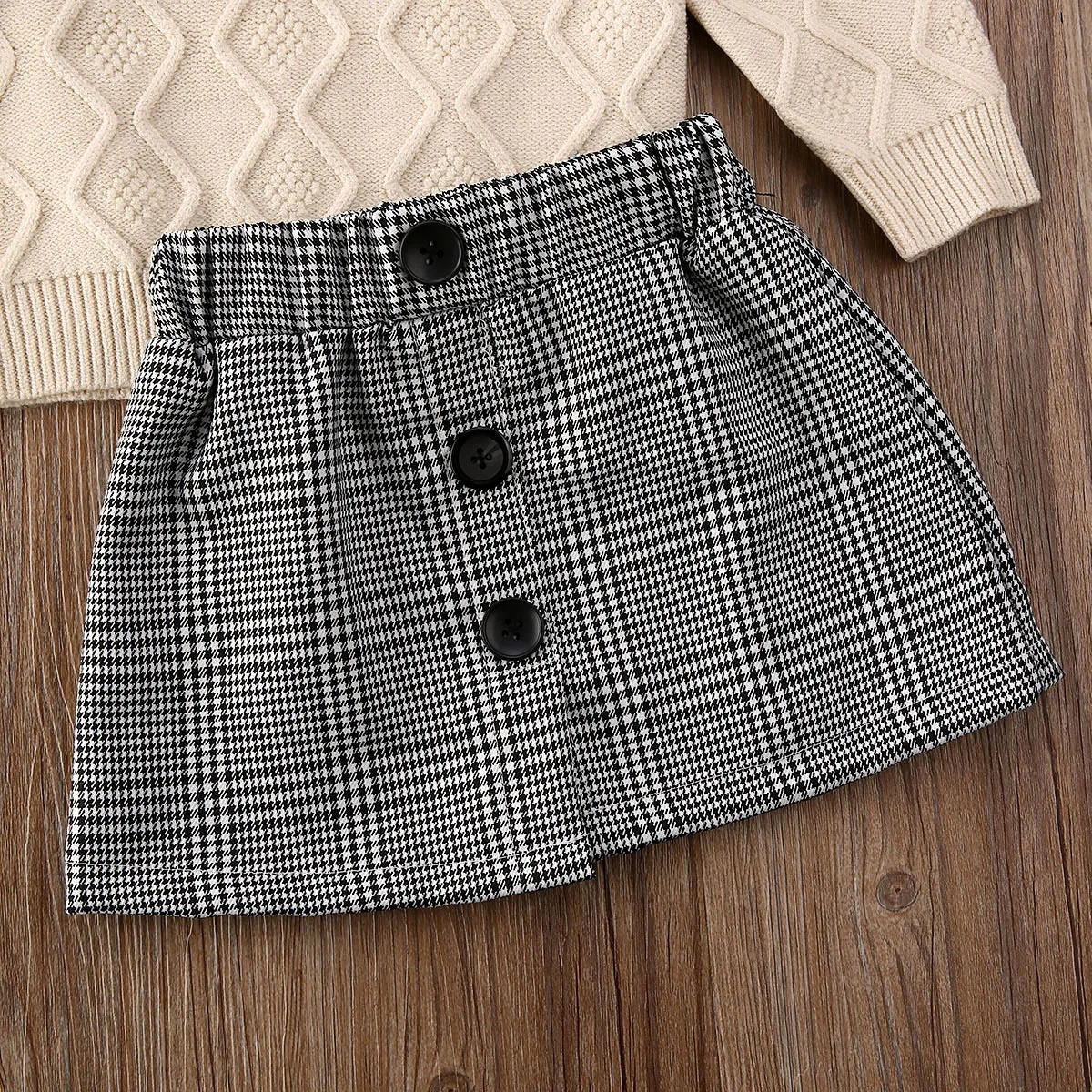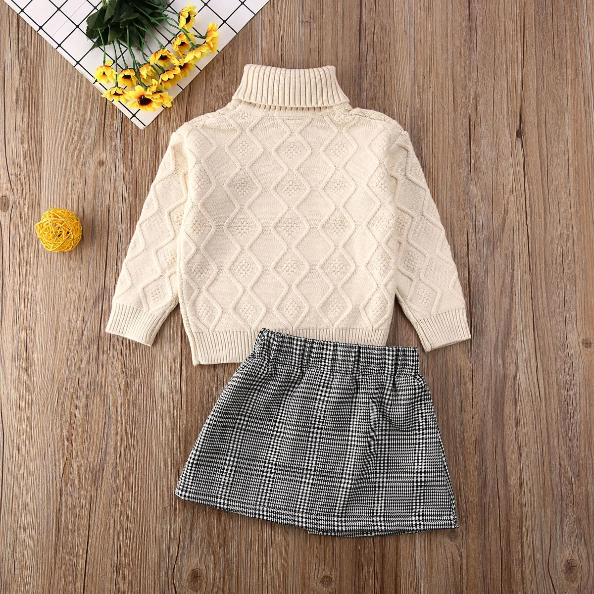 От 2 до 6 лет комплект одежды для маленьких девочек, повседневный вязаный свитер с высоким воротником Топы + клетчатая мини-юбка трапециевидной формы с принтом