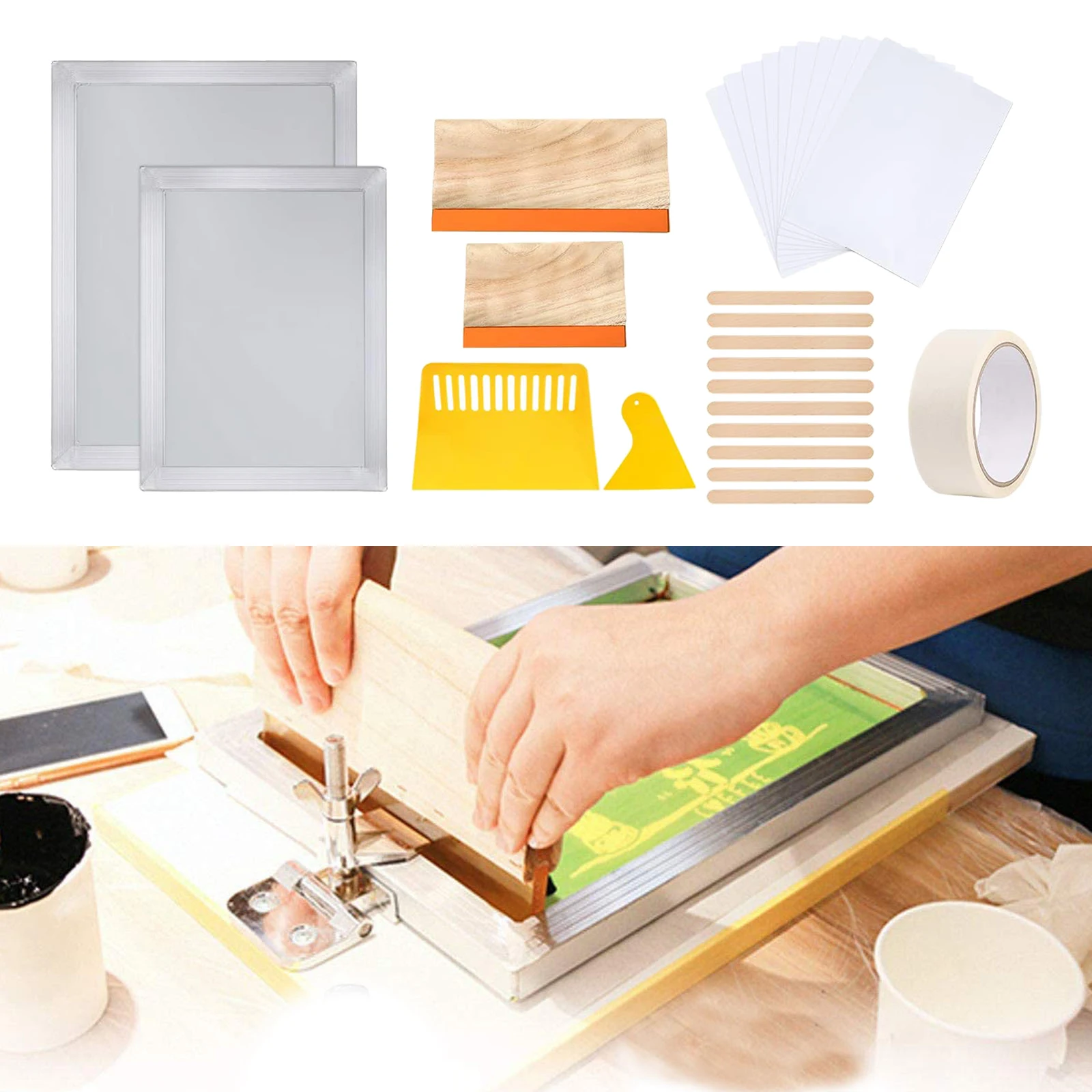 10 шт. деревянные палочки для смешиванияПрозрачная пленка для струйной печати формата А4, 10 шт.Рамы для шелкографии из нержавеющей стали, 2 шт.1 шт. скребок для трафаретной печати1 шт. пластиковый скребок1 шт. малярная лента2 штуки скребок для дерева