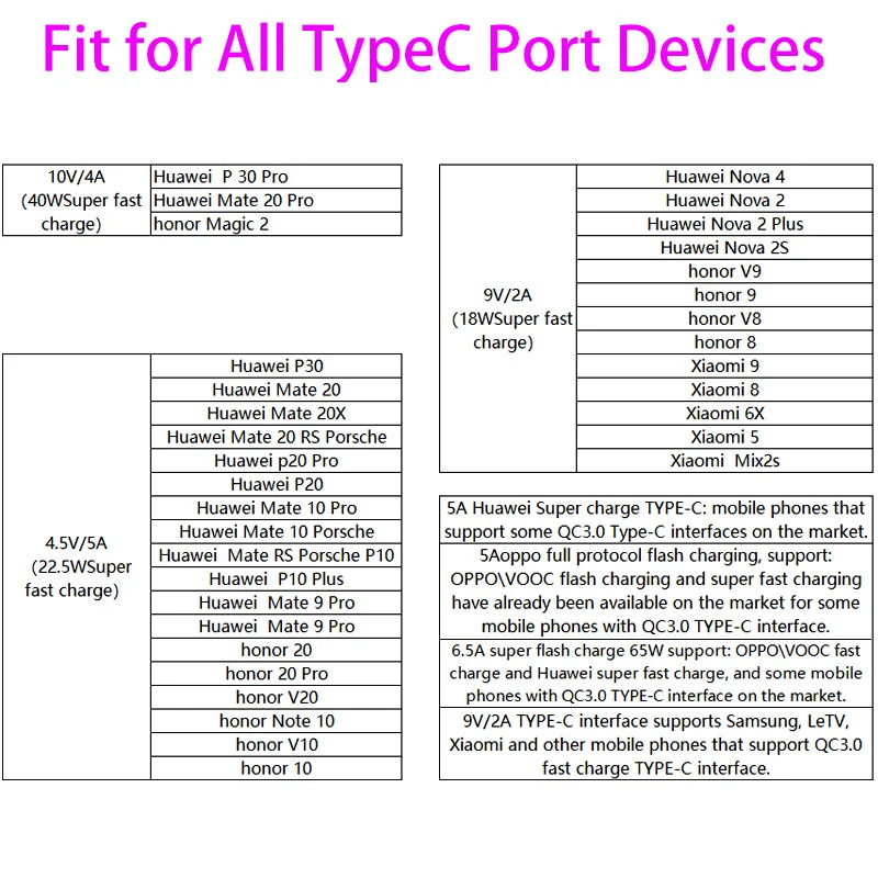 (Примечание: режим SuperCharge 5A поддерживает только для Huawei Mate 9 /9 Pro P10 /P10 и более поздней версии; Совместимость версии телефона: QC3.0 и выше, быстрая зарядка требует вашего телефона, который имеет эту функцию и используется с вилкой зарядного устройства 5A.)