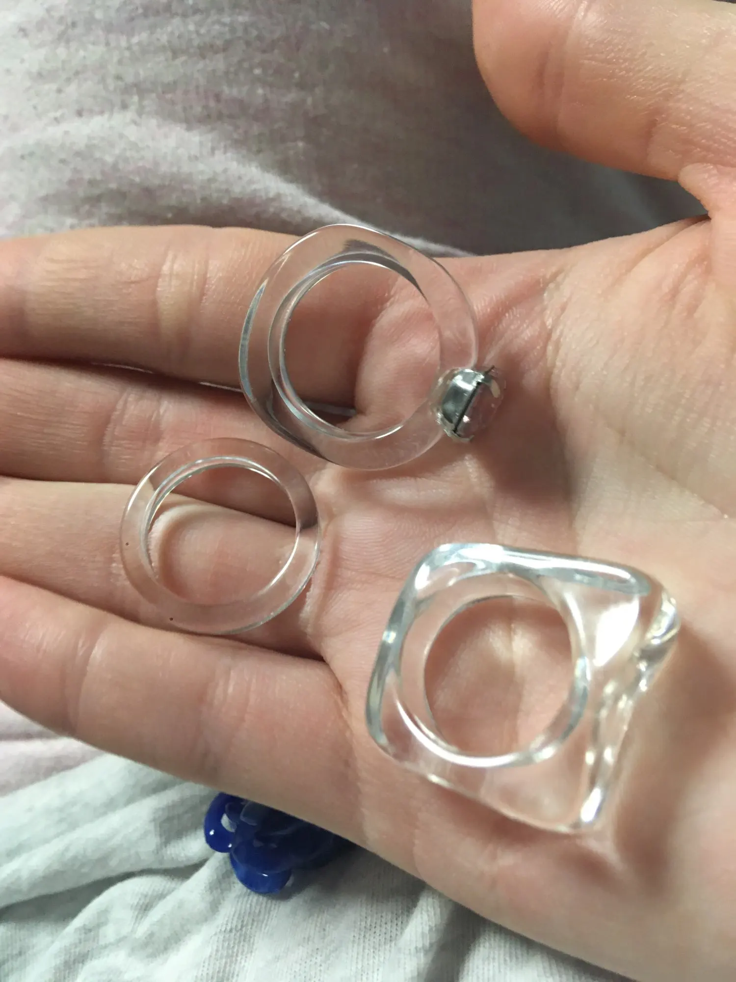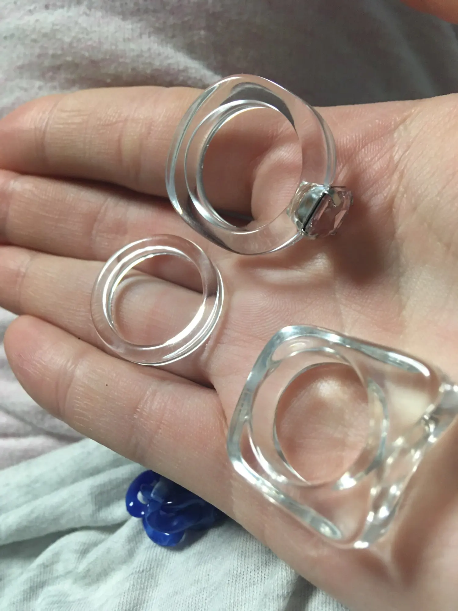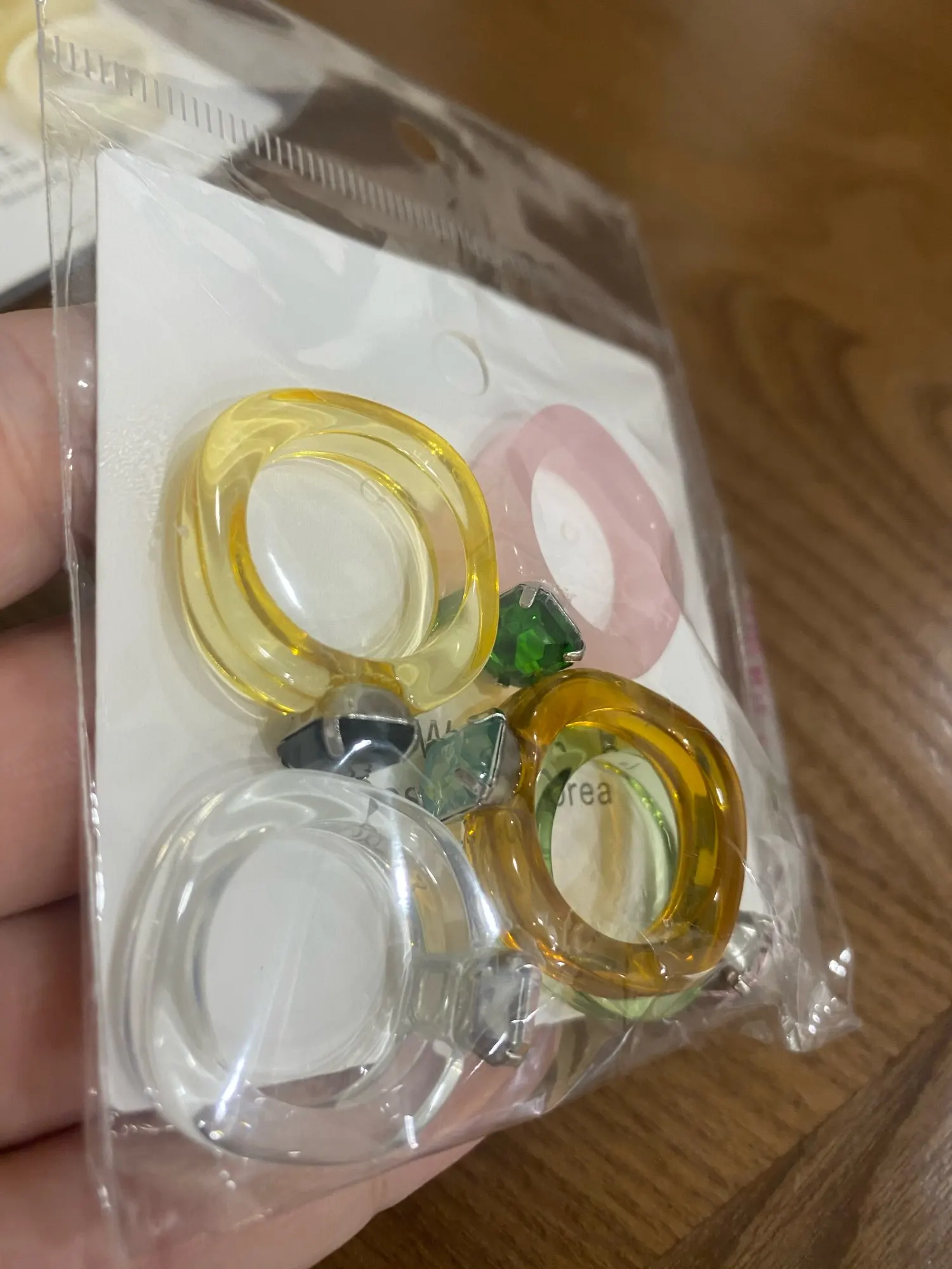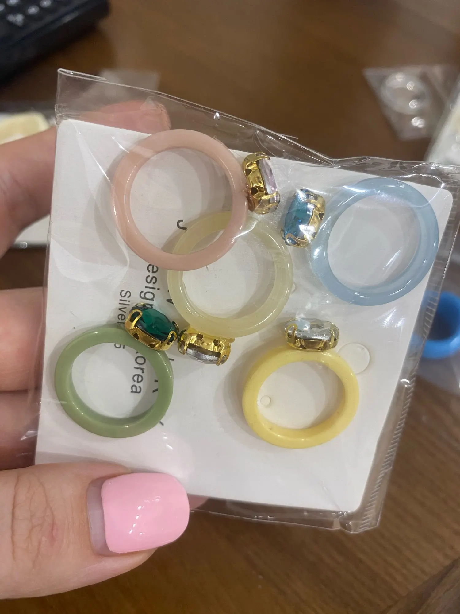 Кольца пришли большого размера, ни одно не подошло на палец. Сами по себе симпатичные, но нельзя указать нужный размер у продавца - это плохо