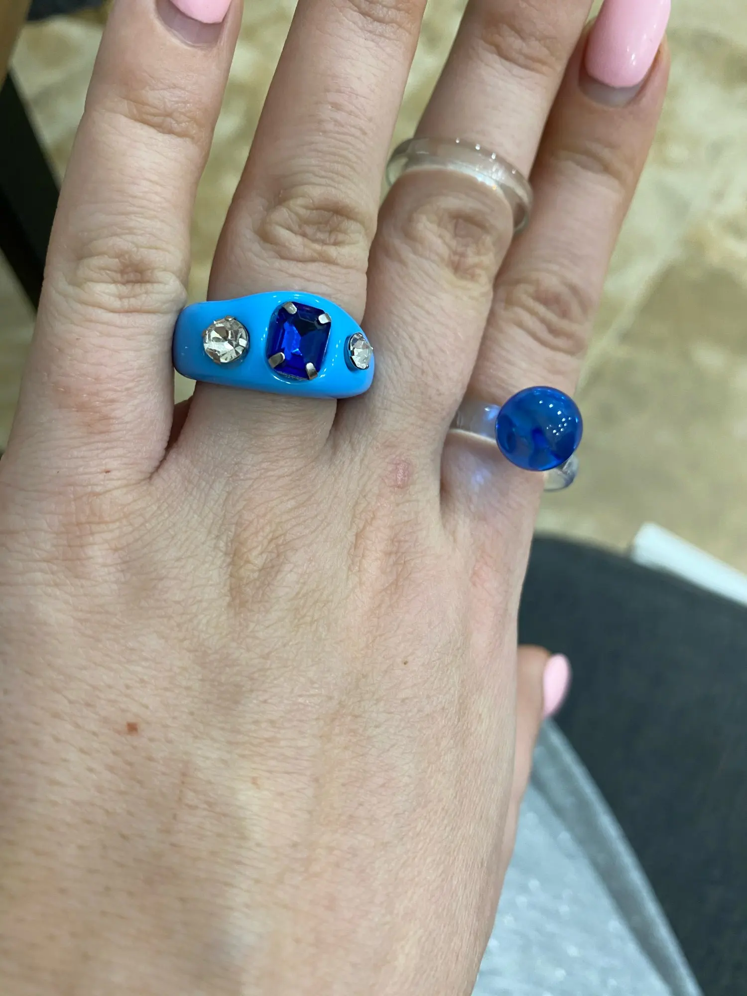 Они прибыли через 1 месяц. Качество приличное. Некоторые бриллианты немного кривые и с клеем. Они слишком большие для меня, но у меня очень тонкие пальцы.