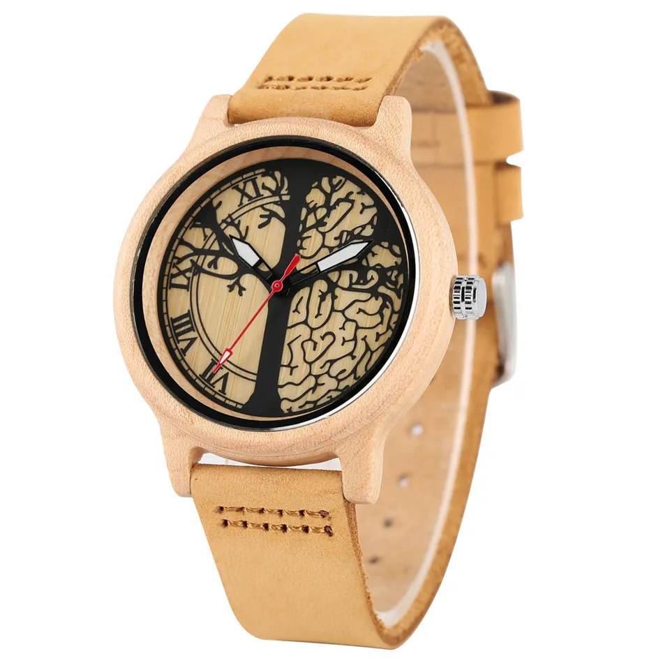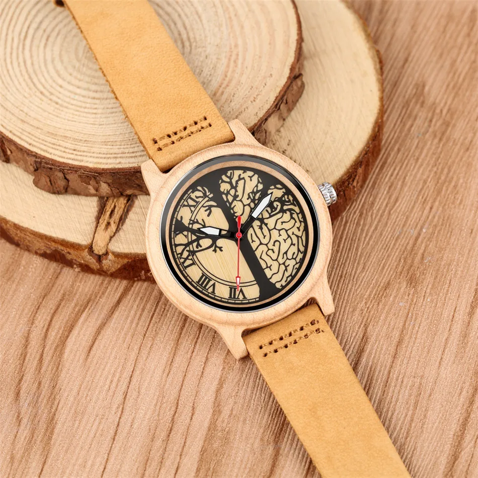 Женские деревянные часы с кожаным ремешком, деревянные часы с рисун...