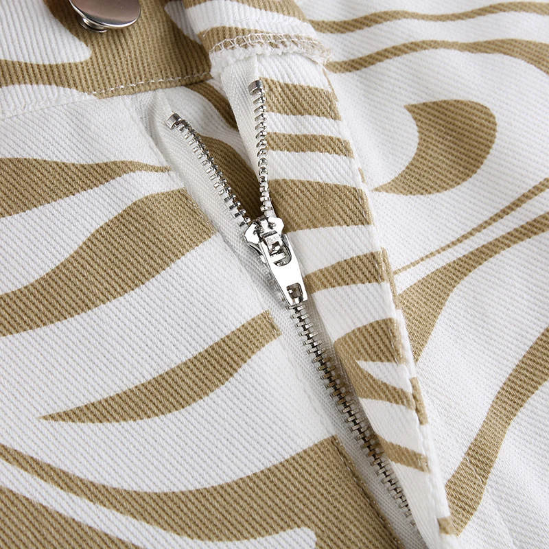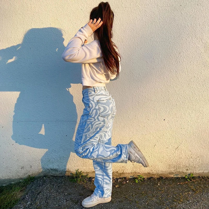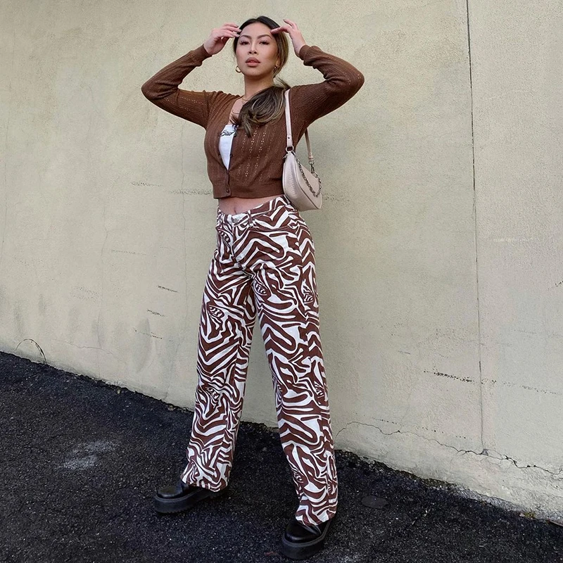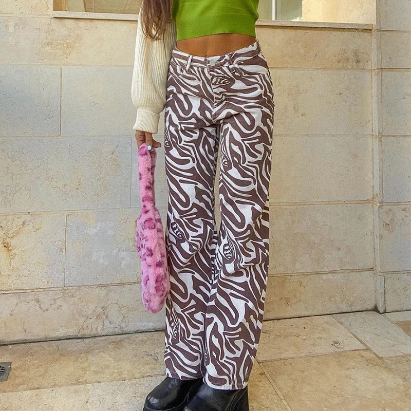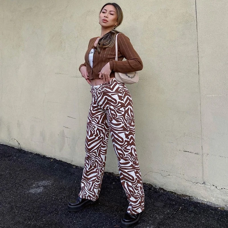 Женские джинсы с принтом зебры, коричневые повседневные винтажные прямые джинсовые брюки для девочек, мешковатые брюки с завышенной талией, Капри, 2021