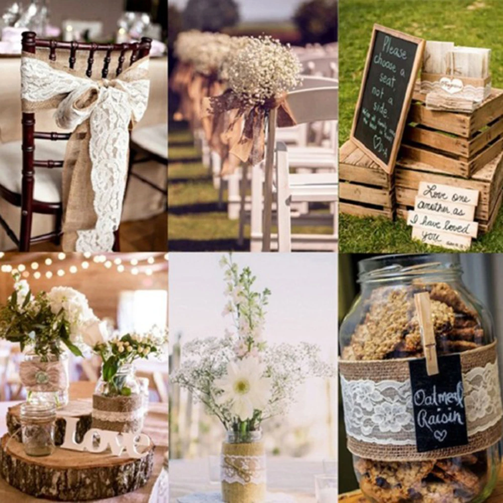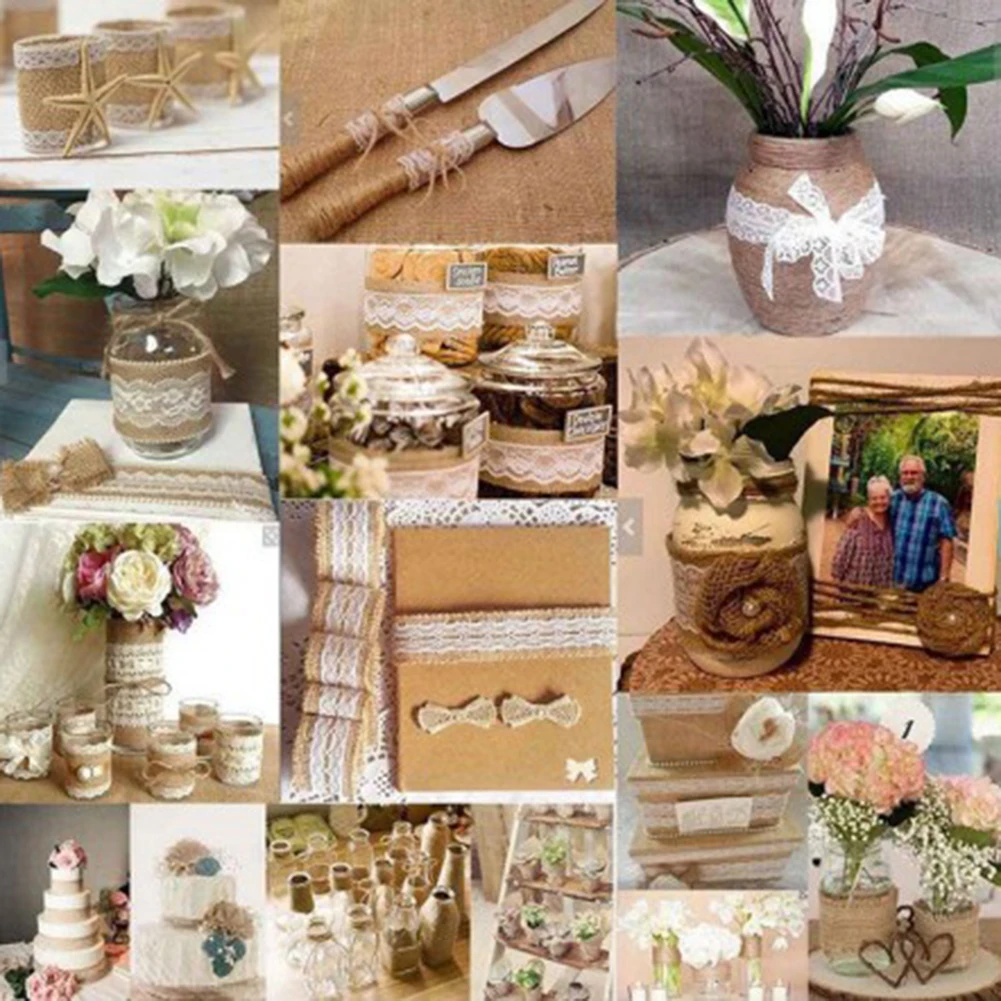 Популярные с фокусным расстоянием 25 мм Новый натурального джута в декорированном мешковиной горшке лента из мешковины с кружевом ленты с белой кружевной отделкой по краю винтажная деревенская Свадьба Центральные Декора