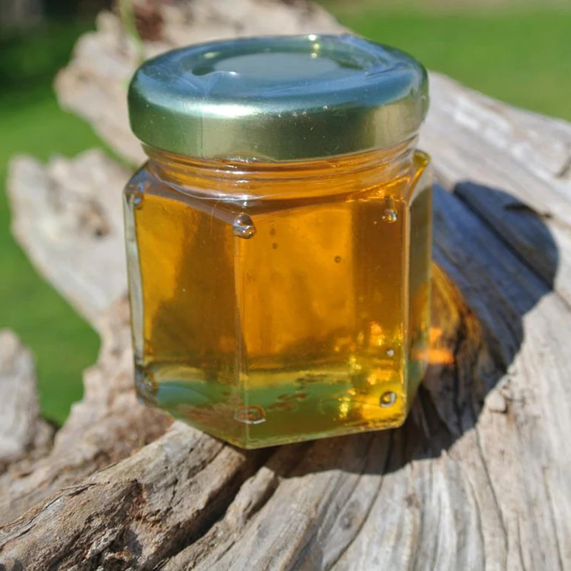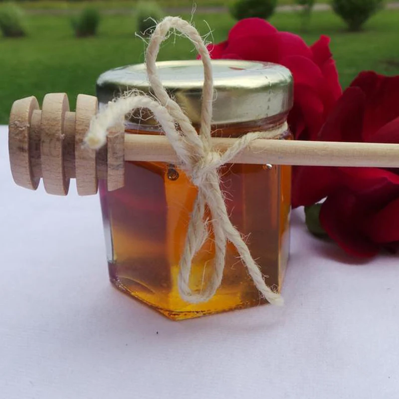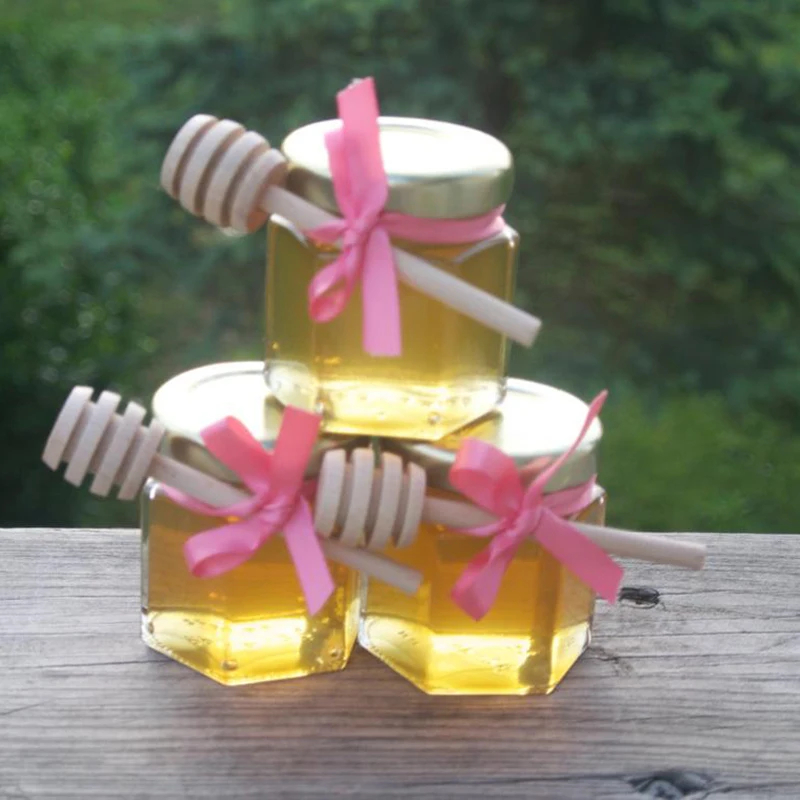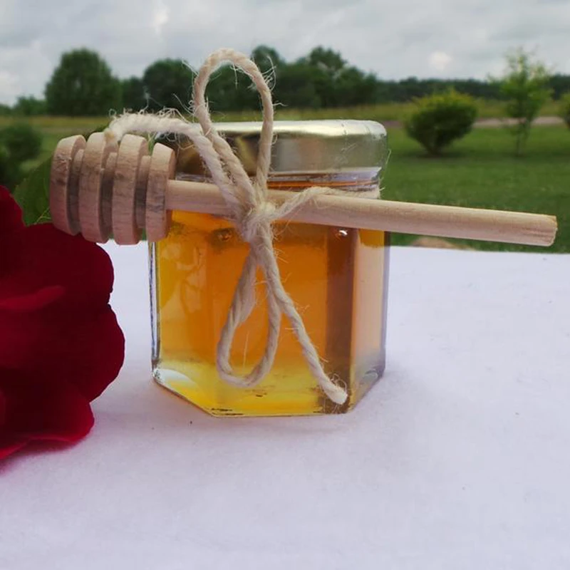 Наши шестигранные баночки наполняются при получении заказа медом объемом 2 унции и украшены шпагатом и мини-деревянными щупами. Они абсолютно красивы и мед исключительно вкусный, они обязательно оставят стойкое впечатление.