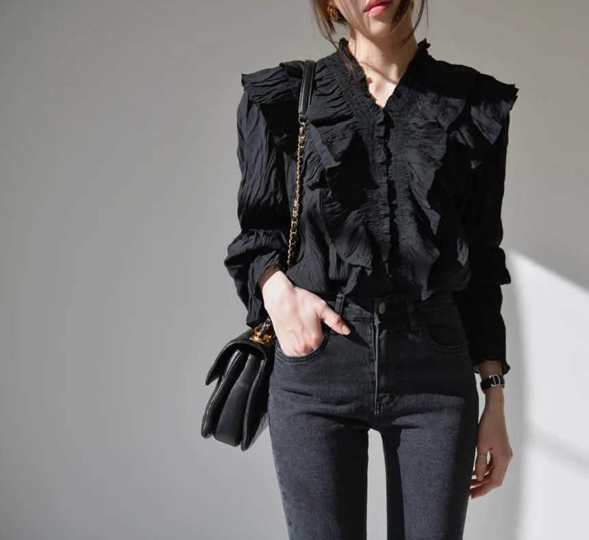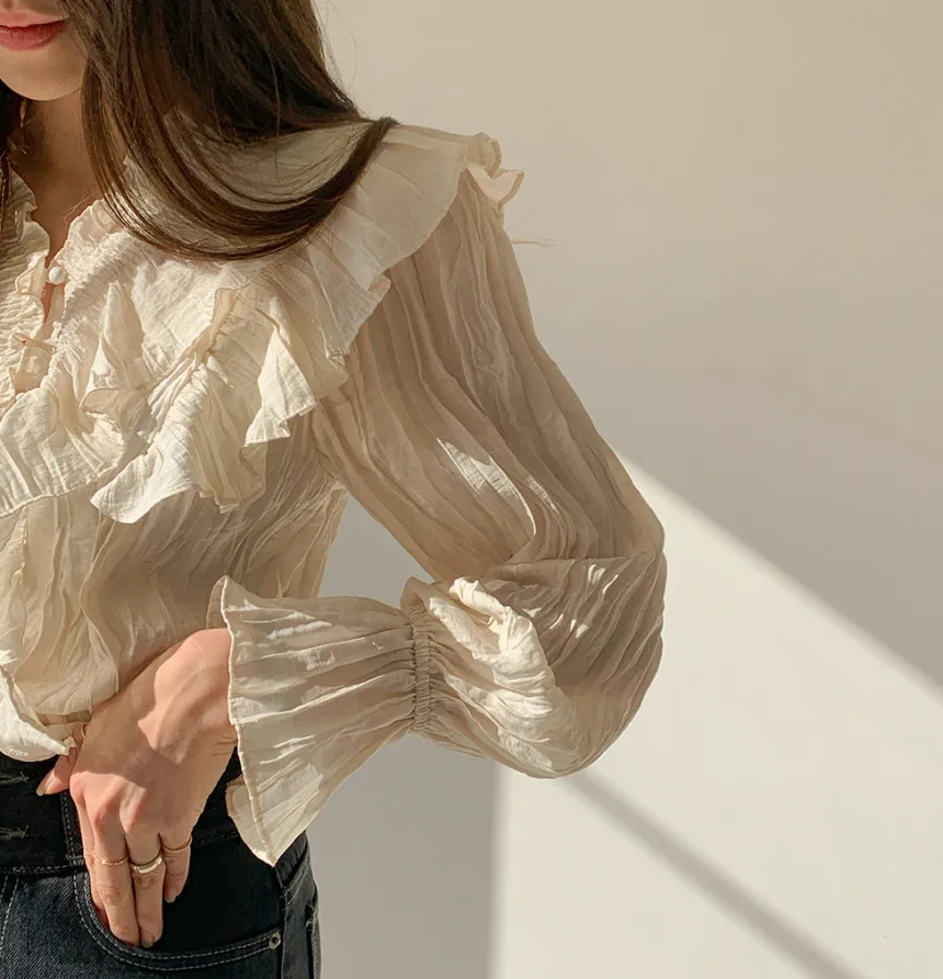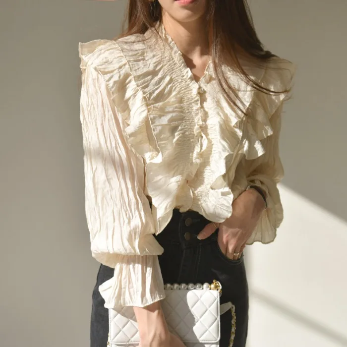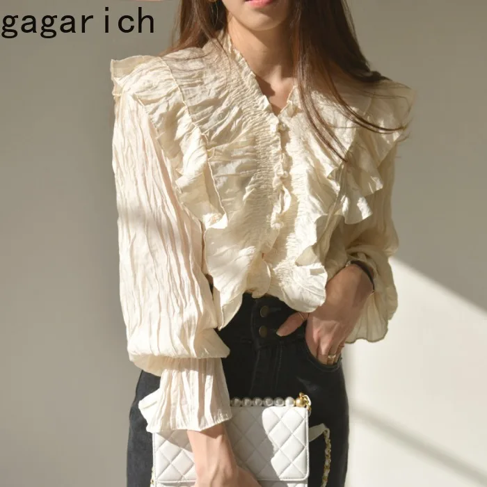 Gagarich женская рубашка 2021 весна-осень французская элегантная Темпераментная Женская Свободная шифоновая блузка с V-образным вырезом и оборками