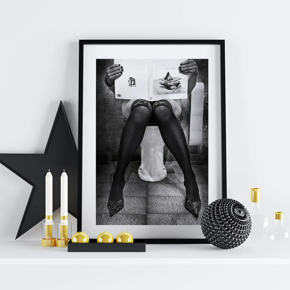 Постер чтения газеты на унитазе, черная, белая женская фотография, холст, живопись, настенное искусство, картины для гостиной