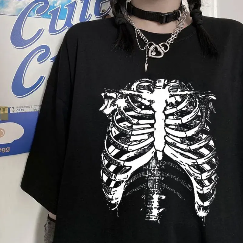 Женская футболка с принтом в виде темных черепов, костей, сердца и легких, летний топ в стиле панк, уличная одежда с коротким рукавом