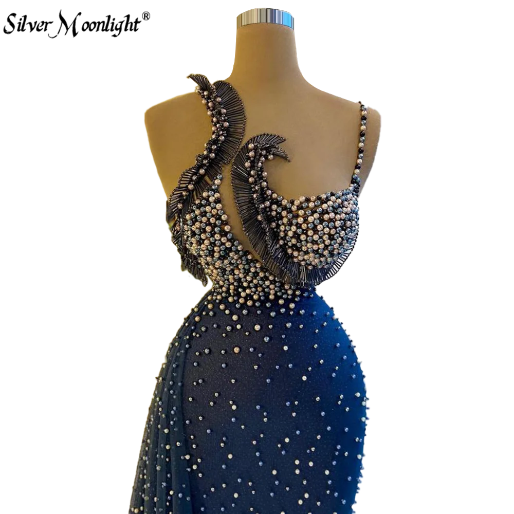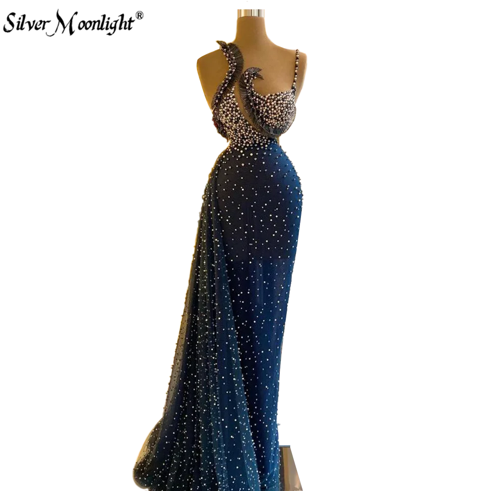Элегантное темно-синее вечернее платье с бисером и пайетками, длинное платье с жемчугом на одно плечо, исламские турецкие платья по индивидуальному заказу