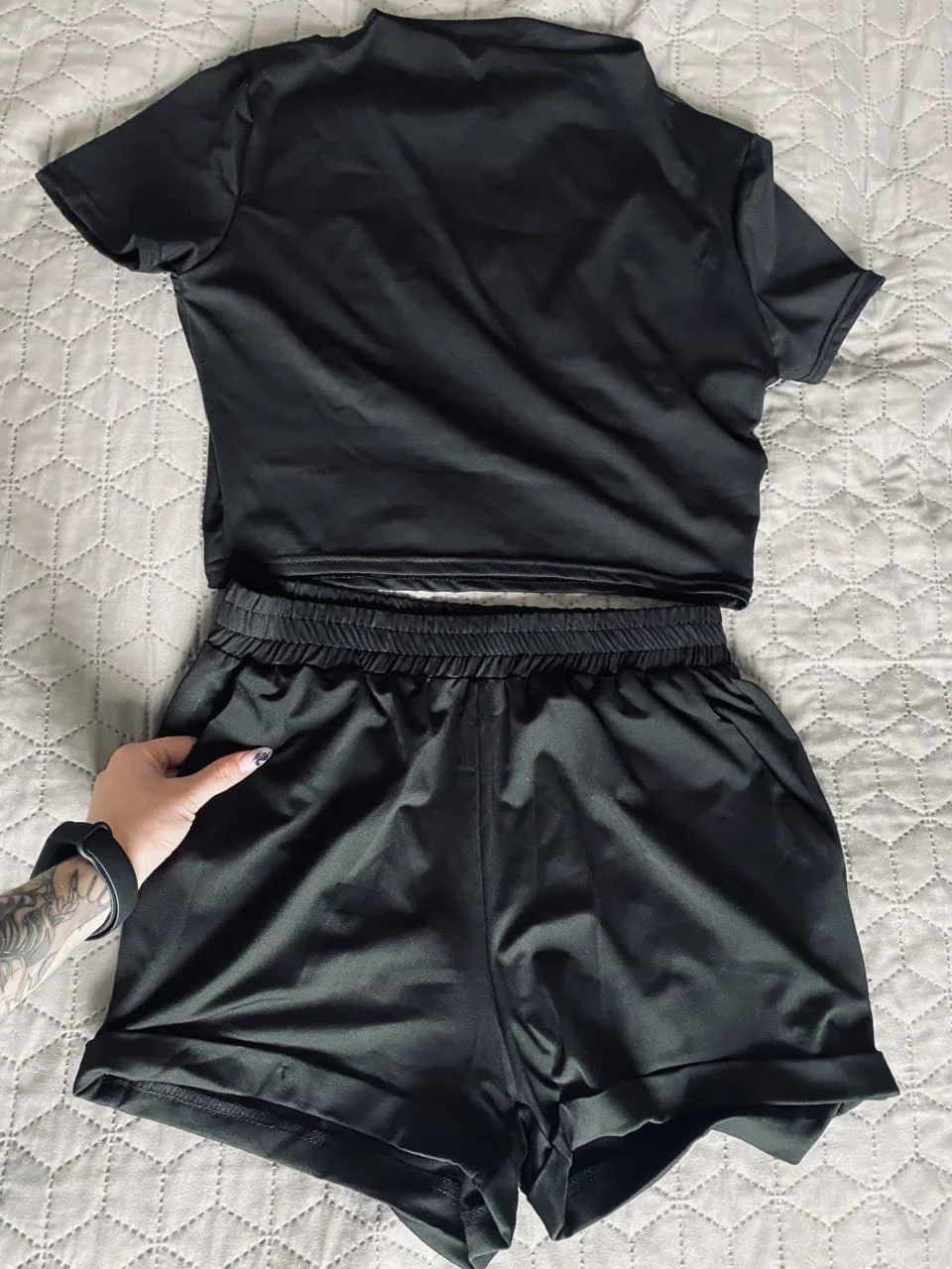 Топ женский спортивный с коротким рукавом и шорты с завышенной талией, однотонный, 2 шт.