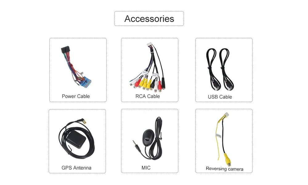 Один кабель RCA с внешним входом микрофона, один кабель камеры заднего вида с Wi-Fi и сигнальными кабелями BT, один антенный кабель GPS, два usb-кабеля, один установочный инструмент, один внешний микрофон
